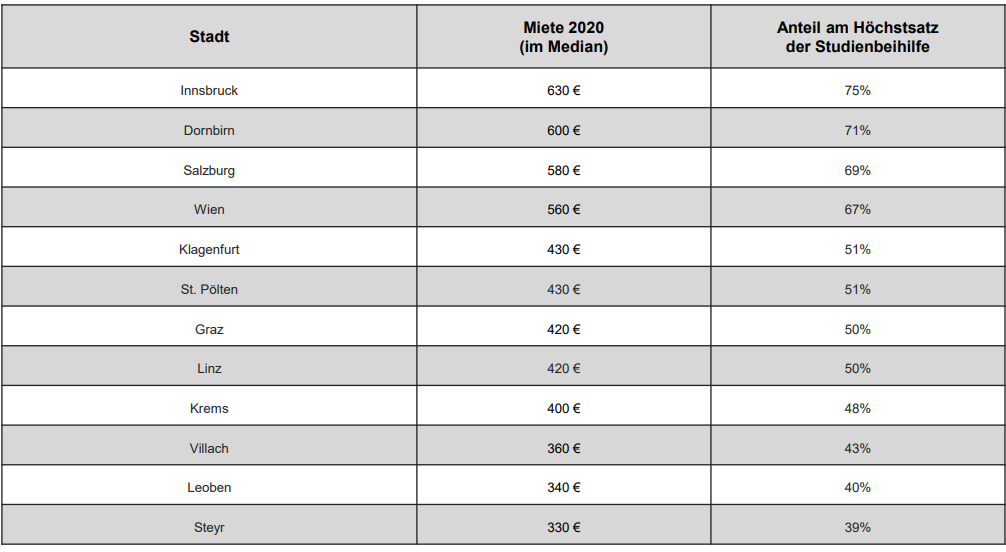 Der Preisanstieg bei Singlewohnungen bis zu 40 Quadratmeter trifft Studierende besonders hart, zumal durch die Coronakrise viele der typischen Nebenjobs in Handel, Tourismus und Gastronomie weggebrochen sind. Laut einer Analyse des Wohnungsportals Immowelt kostet eine Garconniere in Wien 560 Euro im Monat (Median), das sind mehr als zwei Drittel der maximal ausgezahlten Studienbeihilfe. Die teuerste von 12 untersuchten Unistädten ist Innsbruck (630 Euro Miete).