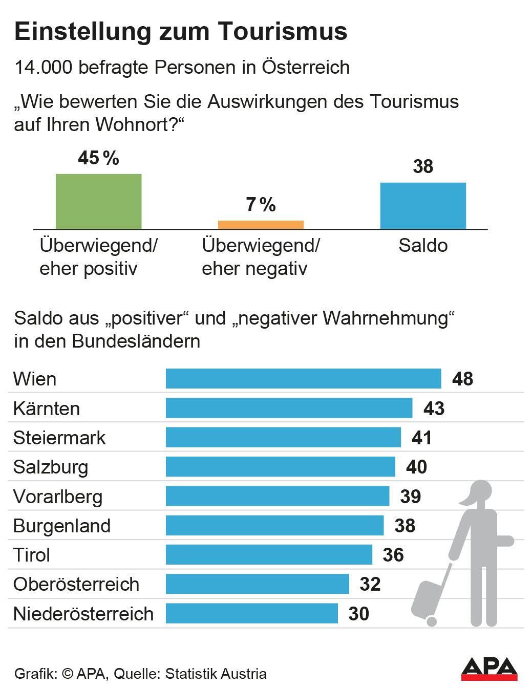 Regarding the general approval of the sector, regional differences are evident. Tourism acceptance is highest in Vienna, as statisticians calculated based on the difference between positive and negative perceptions. For the federal capital, the value is 48 percentage points, followed by Carinthia (43), Styria (41), Salzburg (40), Vorarlberg (39), and Burgenland (38). Below the federal average of 38 percentage points were Tyrol (36), Upper Austria (32), and the last place Lower Austria (30).