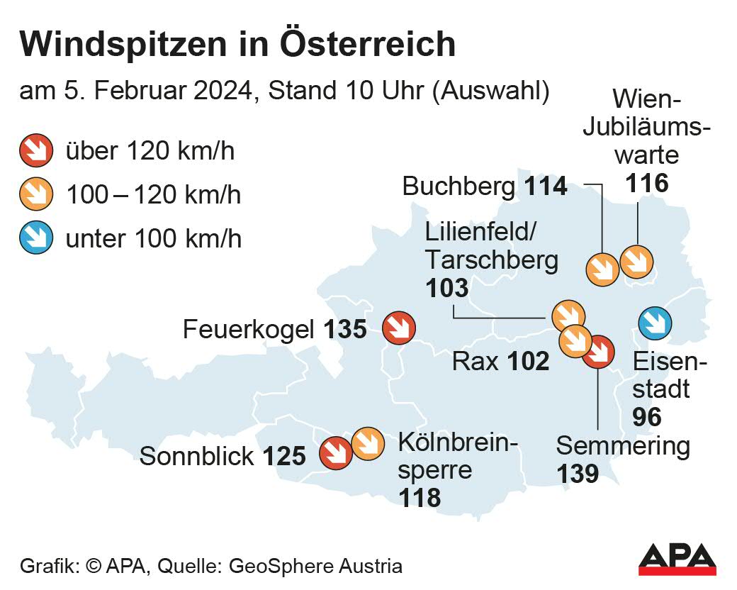 Die österreichweit stärksten Windspitzen in den vergangenen 24 Stunden wurden am Semmering/Sonnwendstein gemessen. 139,3 km/h waren es hier laut Geosphere Austria am Montagvormittag, 153,7 km/h der Höchstwert am Vortag. Am Feuerkogel in Oberösterreich wurden am Montag bis 10.00 Uhr bis zu 135 km/h registriert, am Sonnblick in Salzburg waren es 124,6 und an der Kölnbreinsperre in Kärnten 118,4 km/h.