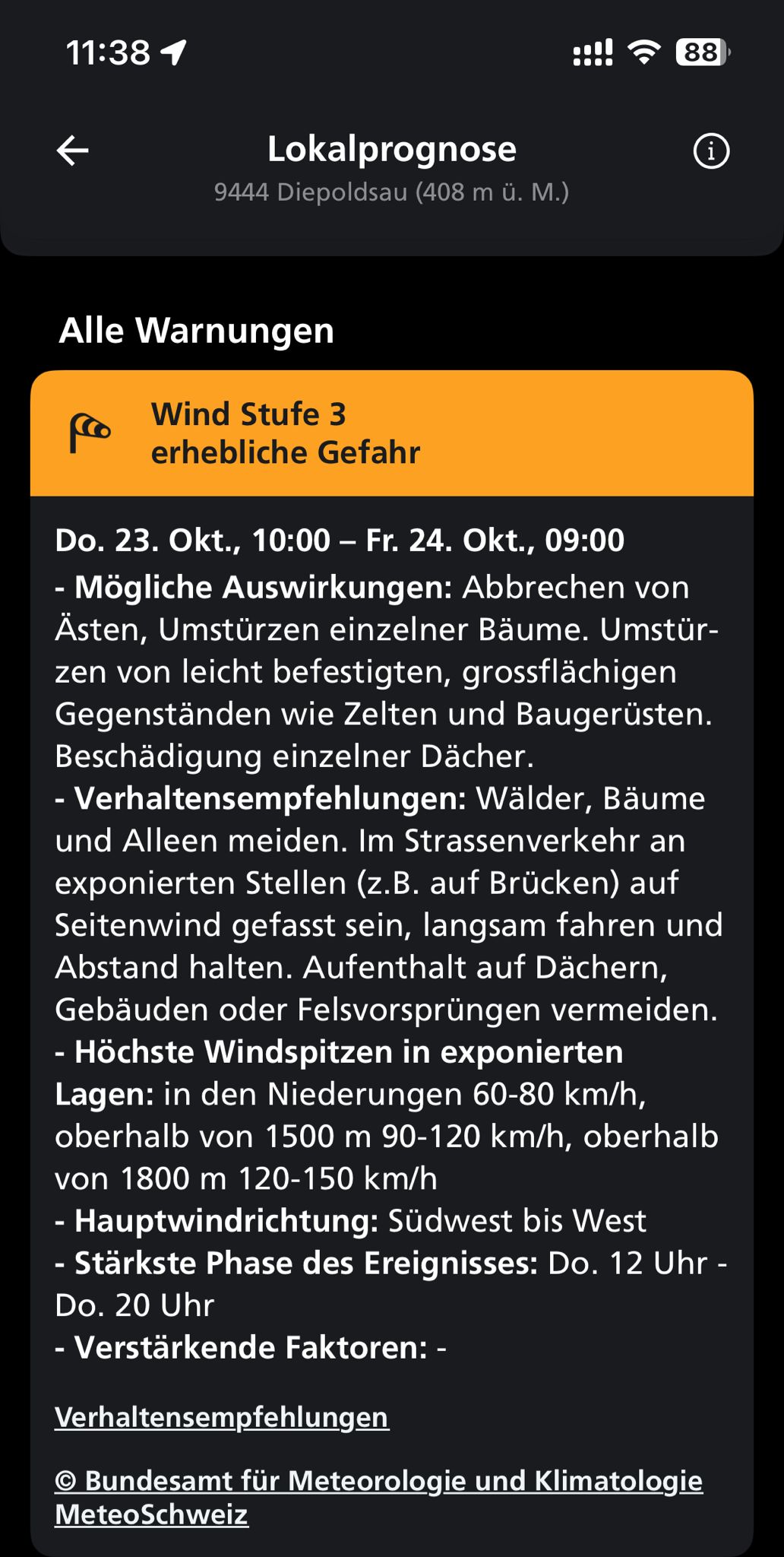 Die Warnung des Bundesamts für Meteorologie in der Schweiz, gültig auch für Grenzregionen wie das Rheintal ist eindeutig: Zwischen Donnerstag, 10 Uhr, und Freitag, 9 Uhr, gilt Windwarnung der Stufe 3 – "erhebliche Gefahr".