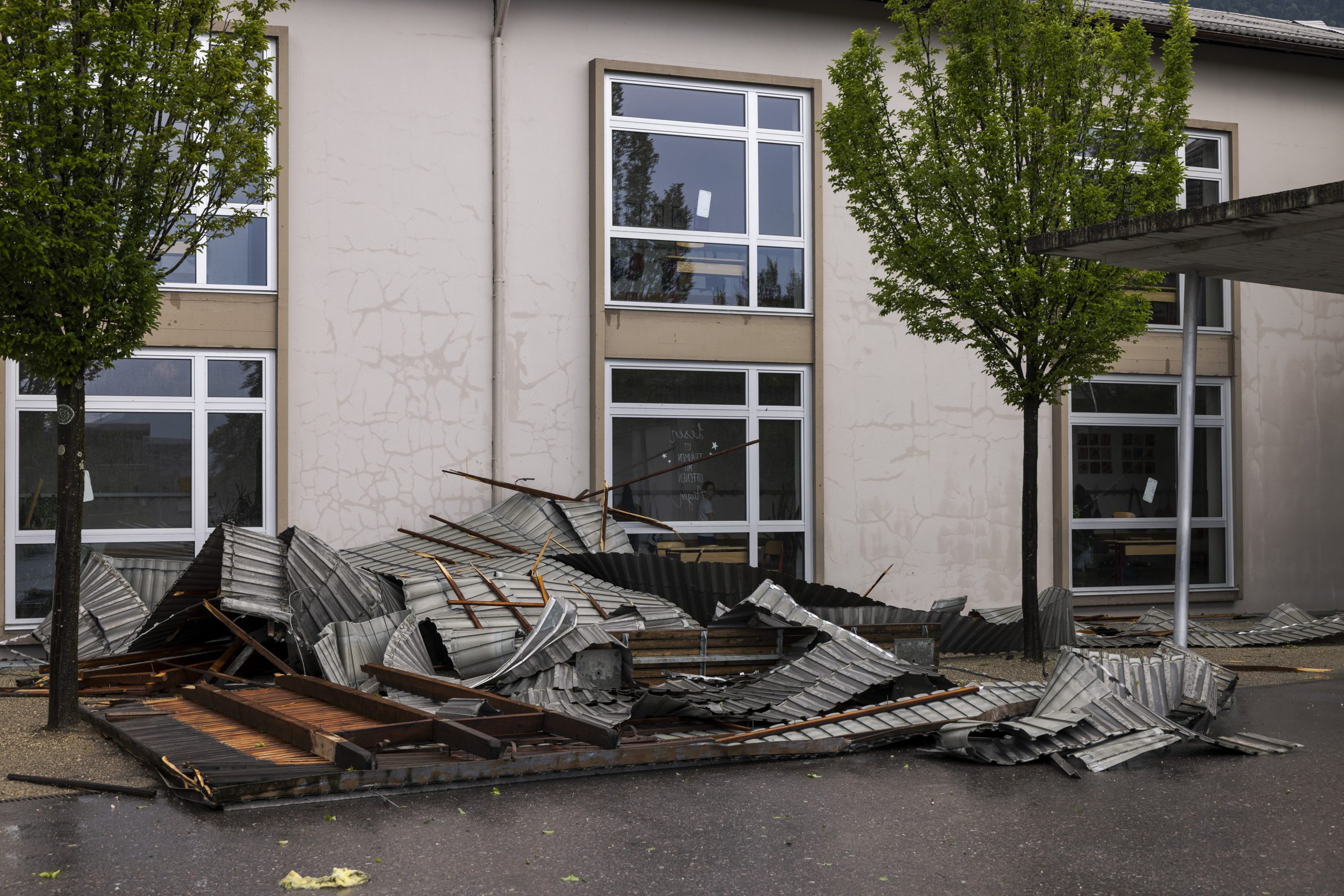 In der Jakob-Hannibal-Straße in Hohenems wurde das Dach der Sporthauptschule Markt schwer beschädigt. Teile des Dachs landeten im Schulhof, die Feuerwehr sicherte das Gebäude.