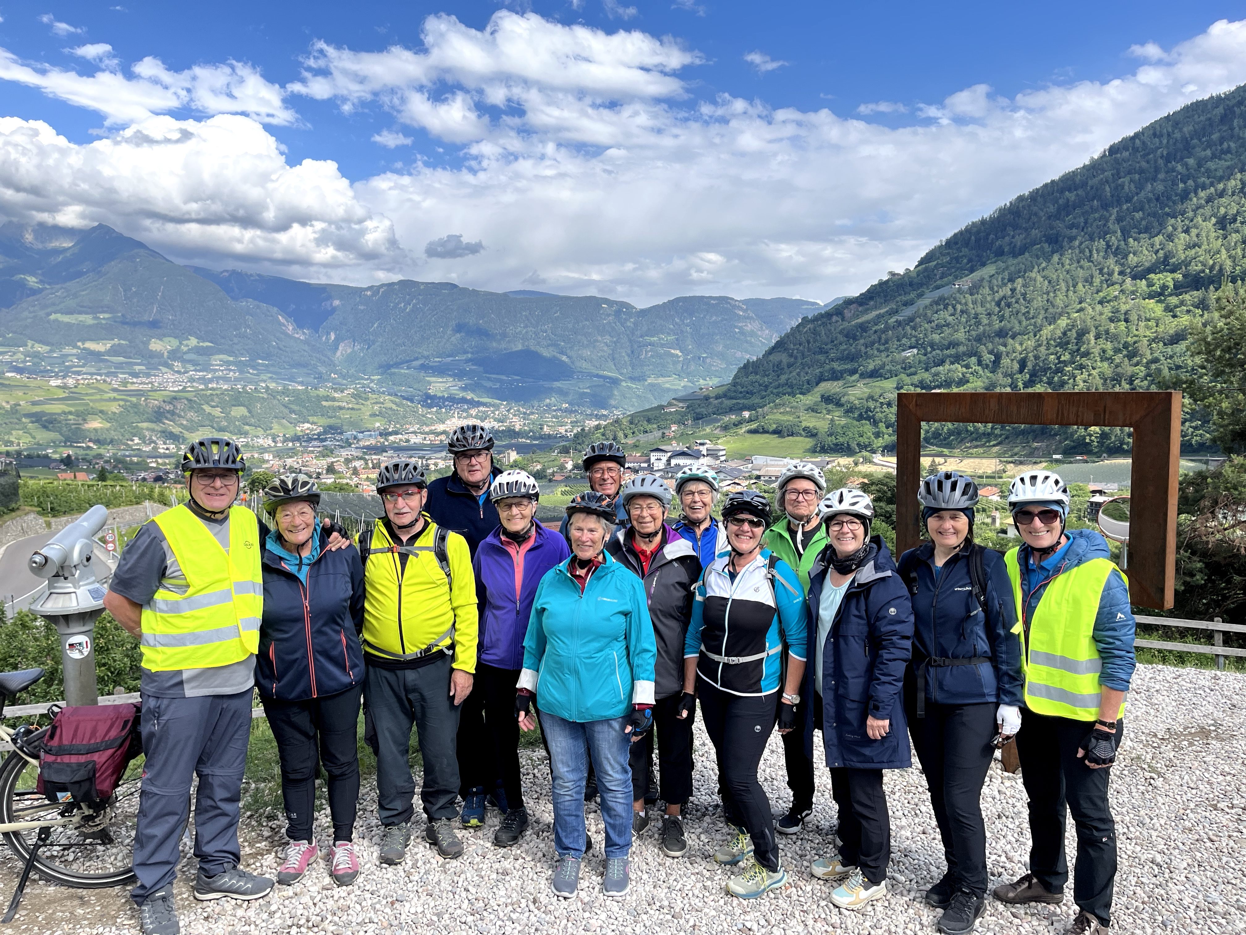 Am Vorabend der Fahrt wurden für die Radfahrer die Räder bei Amann Reisen in den Fahrradhänger verladen, denn 14 Teilnehmerinnen und Teilnehmer unternahmen die bekannte Radtour vom Reschensee bis Meran und weiter zum Hotel in Marling. Beim Start am Reschensee war es sehr frisch, und entsprechend warme Kleidung war notwendig. Gesamt 85 km wurden inklusive zweier Pausen in rund sieben Stunden zurückgelegt. 24 Teilnehmer zogen es vor, den Marlinger Waalweg ab der Staustufe Töll bis nach Marling ins Hotel zu wandern.