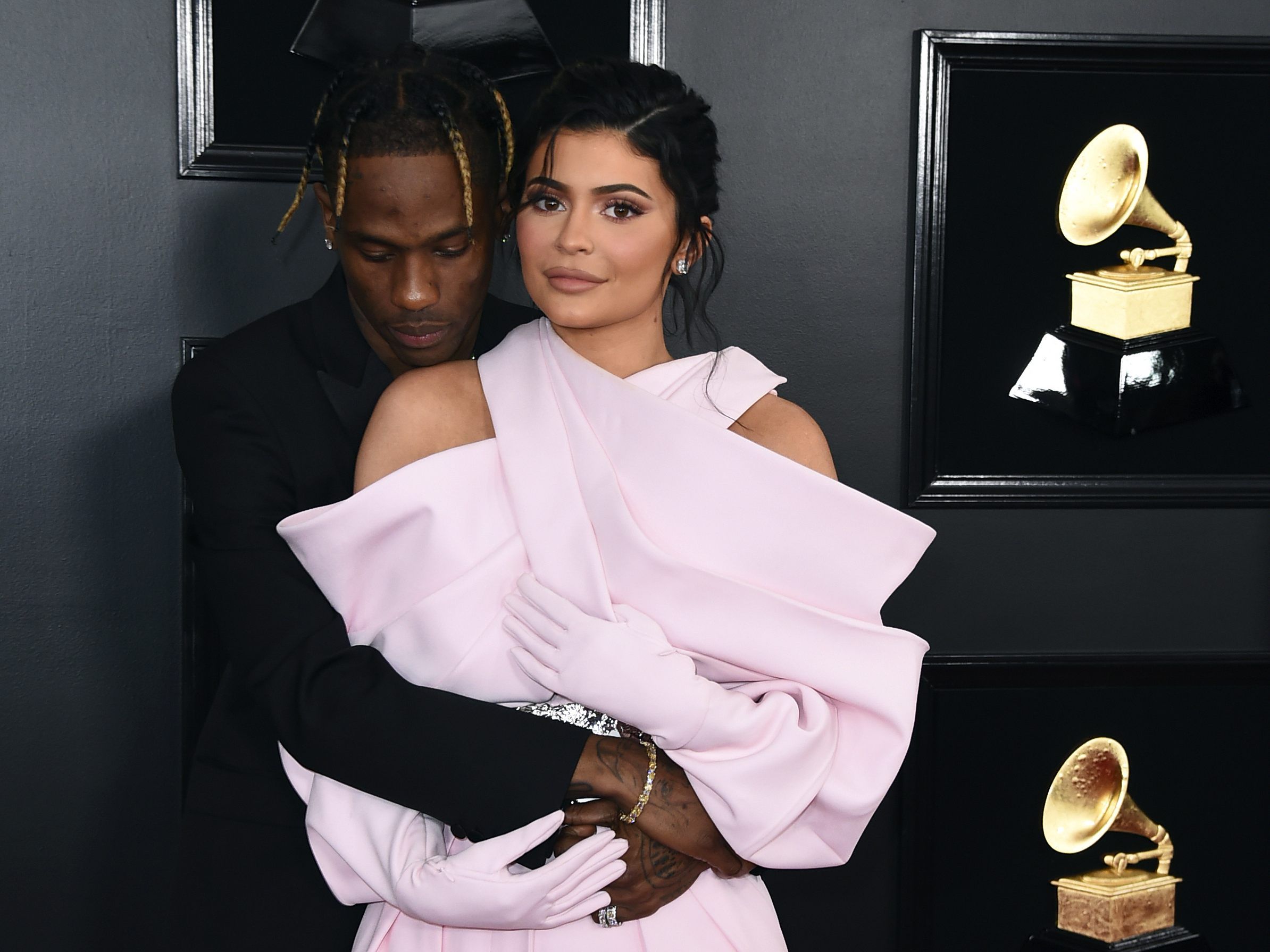©Travis Scott, left, and Kylie Jenner arrive at the 61st annual Grammy Awards at the Staples Center on Sunday, Feb. 10, 2019, in Los Angeles. (Photo by Jordan Strauss/Invision/AP)