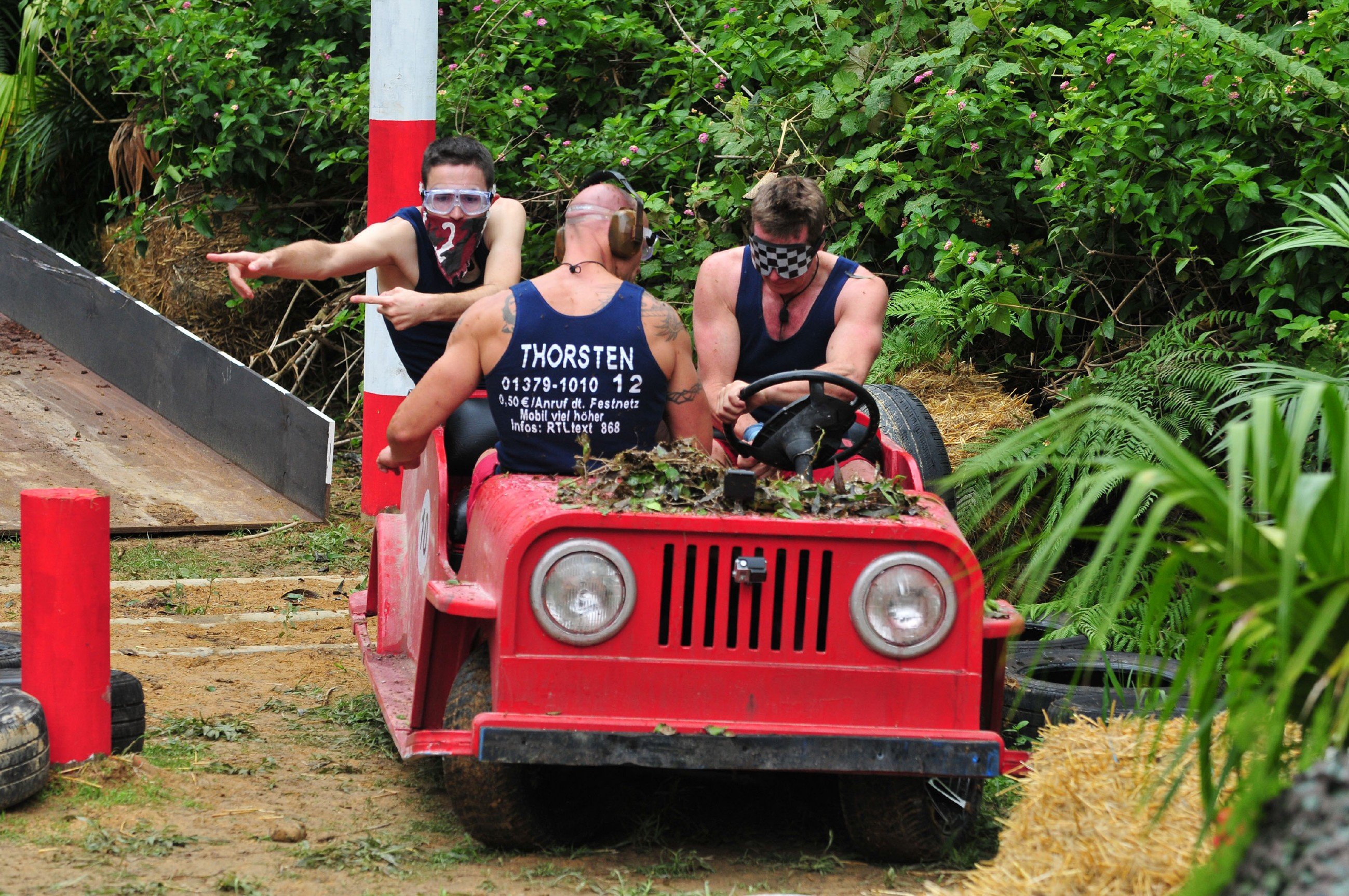 ©ACHTUNG: SPERRFRIST FÜR ALLE MEDIEN BIS DONNERSTAG, 28. JANUAR 2016, 23.30 UHR !!! Tag 14 - Dschungelprüfung 15 "Der Große Preis von Murwillumbah": v.l.: Menderes Bagci, Thorsten Legat und Jürgen Milski müssen gemeinsam in einem Dschungel-Cabrio-Buggy einen Parcours durchfahren. Die Schwierigkeit dabei: Jürgen hat eine blickdichte Brille auf und sitzt am Steuer. Thorsten sitzt neben ihm mit dem Rücken zur Fahrtrichtung und trägt einen Kopfhören wodurch er nichts hören kann. Menderes sitzt auf dem Rücksitz und darf nicht sprechen. Verwendung der Bilder für Online-Medien ausschließlich mit folgender Verlinkung:'Alle Infos zu 'Ich bin ein Star - Holt mich hier raus!' im Special bei RTL.de: www.rtl.de/cms/sendungen/ich-bin-ein-star.html