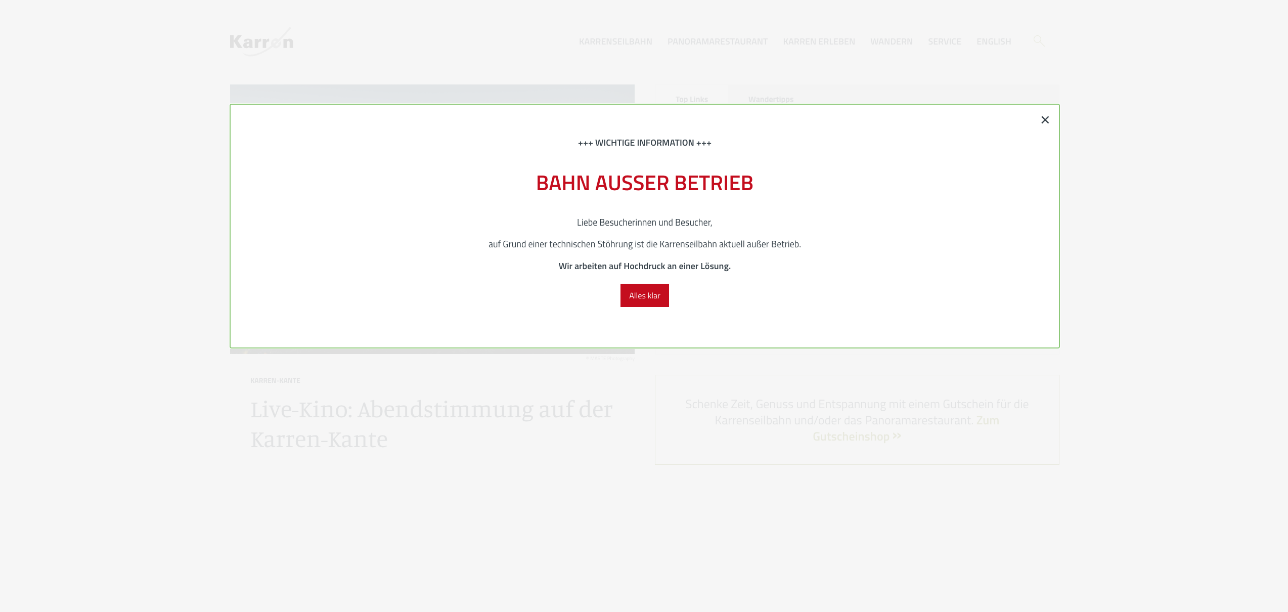 Die Karrenseilbahn in Dornbirn ist aktuell außer Betrieb. Wie auf der Website der Dornbirner Seilbahn AG am Donnerstag mitgeteilt wurde, liegt eine technische Störung vor. „BAHN AUSSER BETRIEB - Liebe Besucherinnen und Besucher, auf Grund einer technischen Störung ist die Karrenseilbahn aktuell außer Betrieb. Das Panoramarestaurant hat geöffnet, ist jedoch im Moment nur zu Fuß erreichbar. Wir arbeiten auf Hochdruck an einer Lösung“, heißt es auf der Homepage.