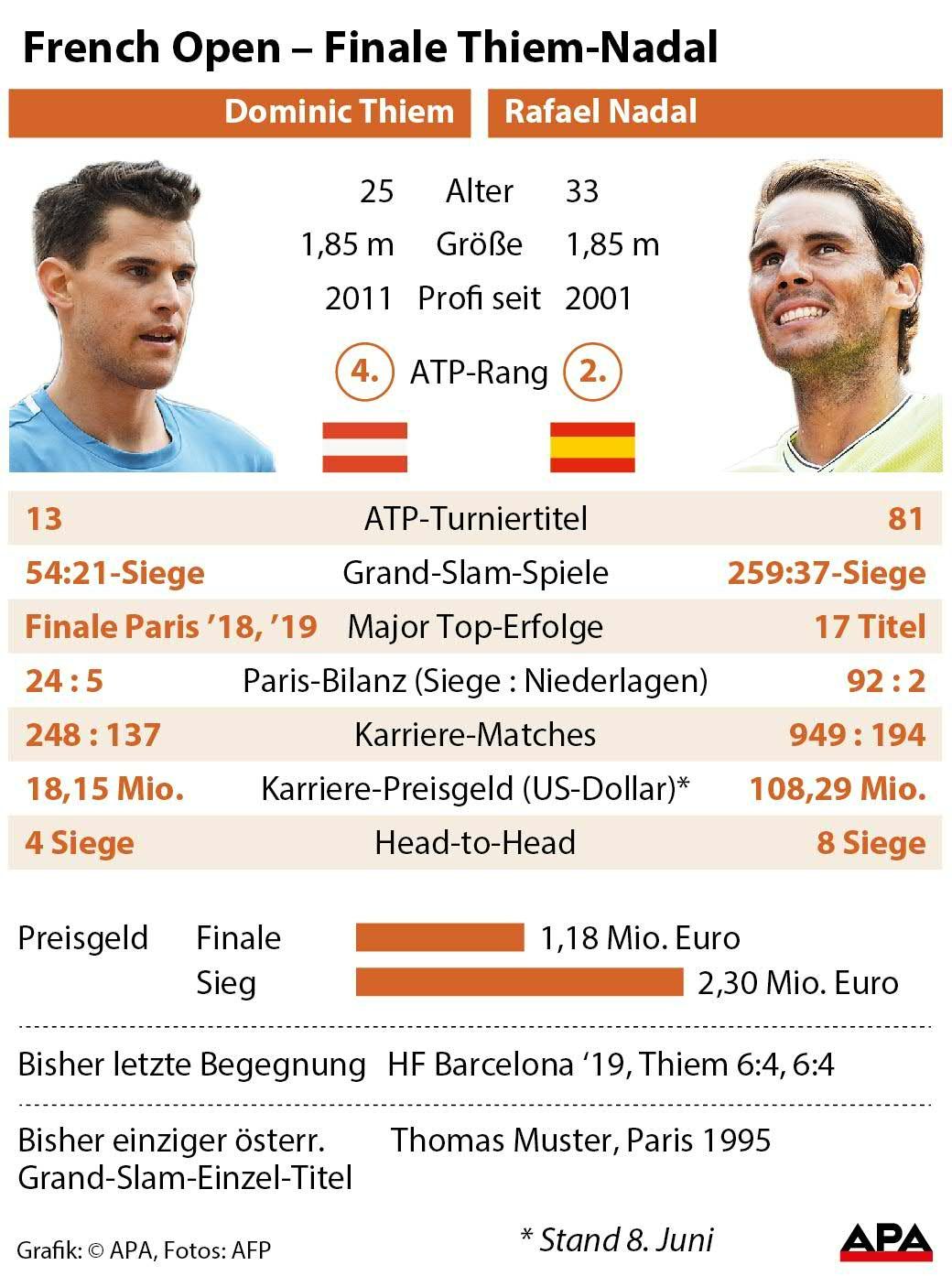 Der Niederösterreicher Dominic Thiem und der Spanier Rafael Nadal bestreiten am Sonntag (15.00 Uhr/live ORF 1) das Finale der French Open in Paris. Thiem besiegte am Samstag im Halbfinale den Weltranglisten-Ersten Novak Djokovic in fünf Sätzen und könnte nun als zweiter Österreicher nach Thomas Muster (French Open 1995) einen Grand-Slam-Titel holen.