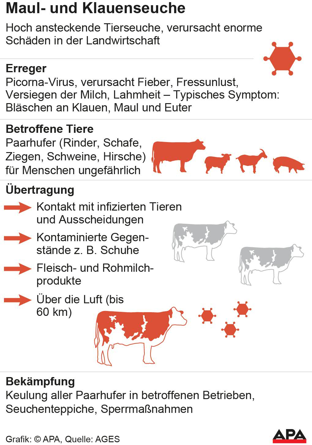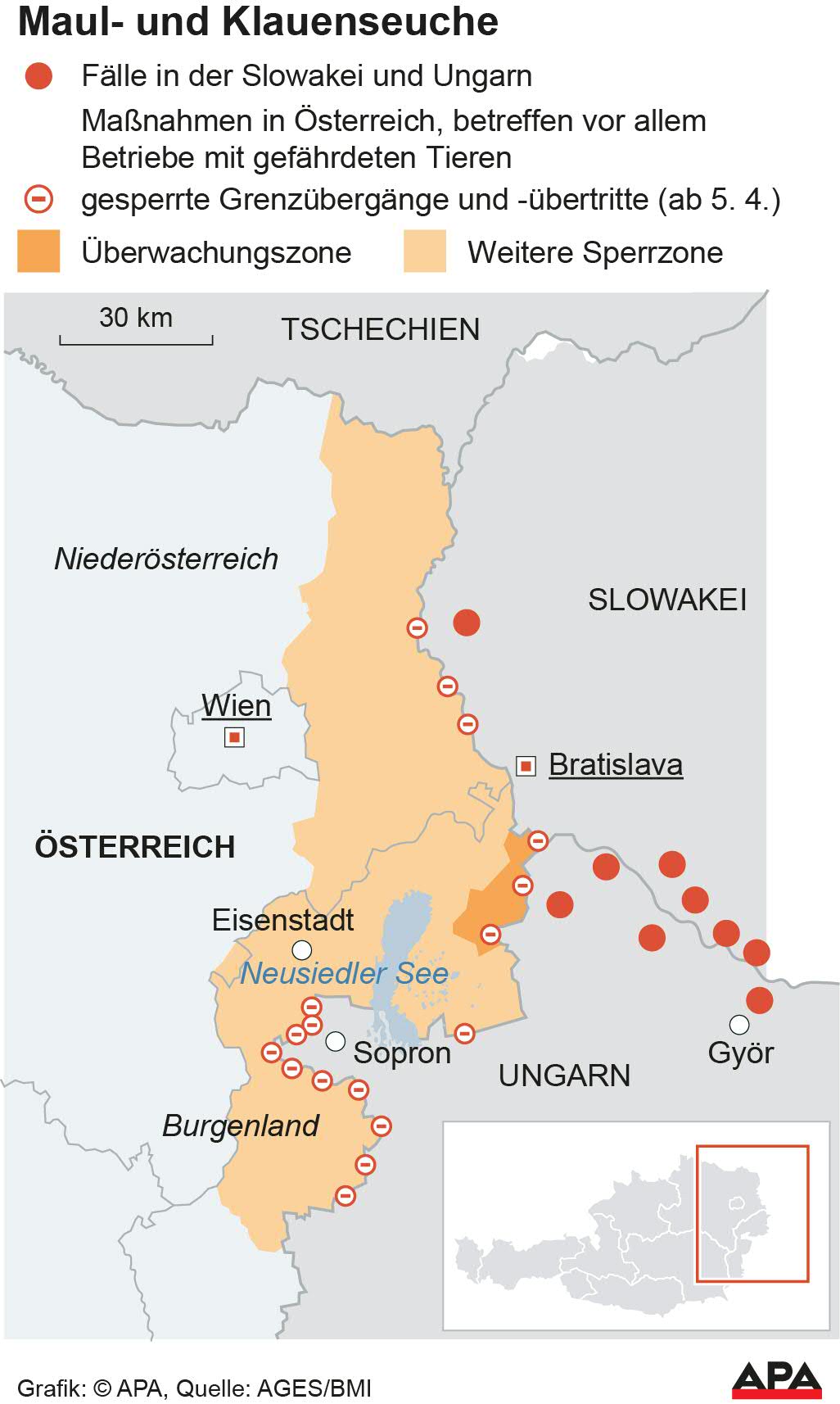 Aufgrund der in den angrenzenden Ländern Slowakei und Ungarn grassierenden Maul- und Klauenseuche (MKS) hat Österreich auch am Freitag weitere Maßnahmen ergriffen. Neben abgesagten Rinderschauen in Niederösterreich und Salzburg wurden teilweise auch Streichelzoos vorsorglich gesperrt. Am Samstag werden vorläufig 24 Grenzübergänge geschlossen, teilte das Innenministerium mit. Zur Bekämpfung wurden Seuchenteppiche ausgelegt.