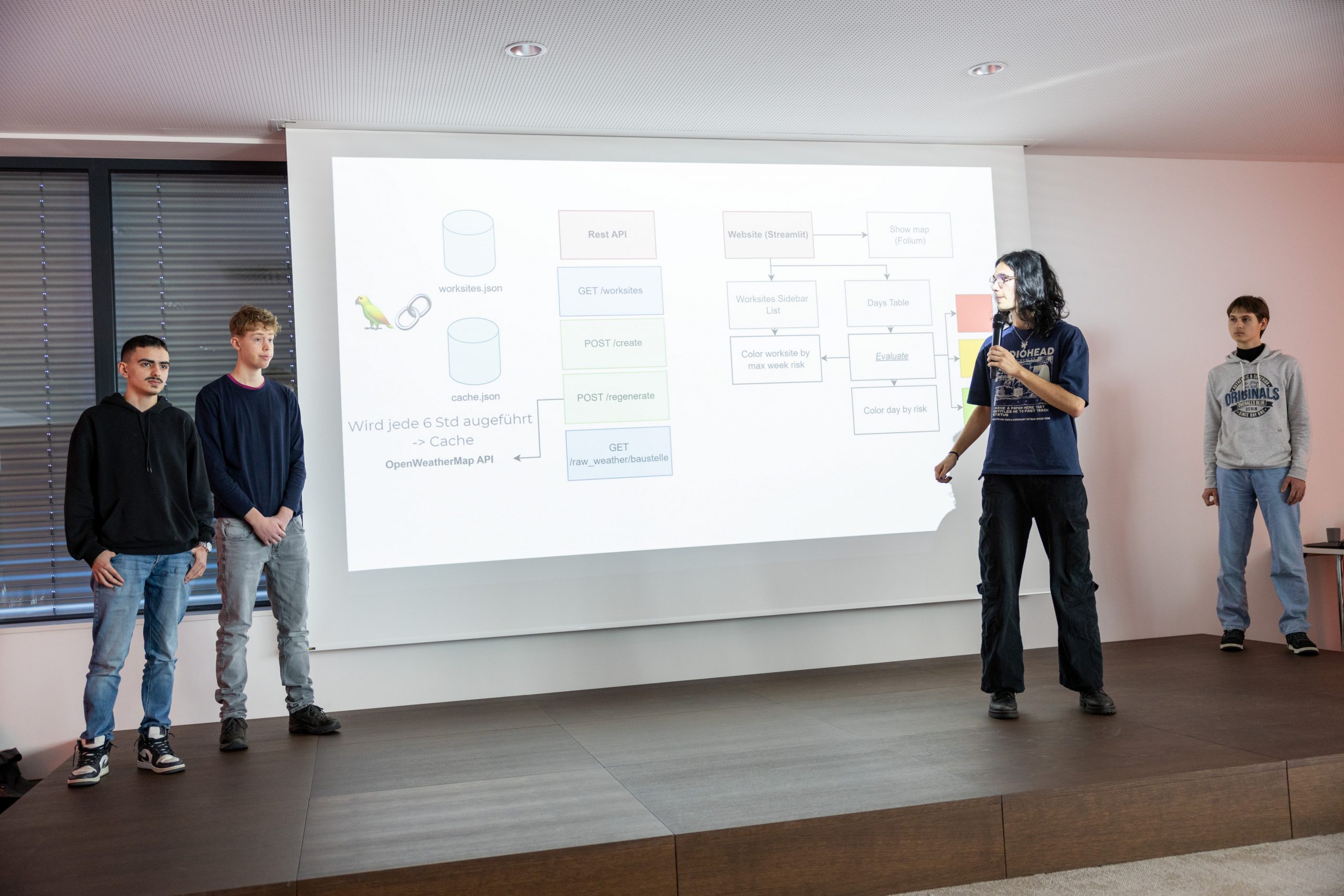 Genauso wie eine weitere Idee, diesmal von Team „Coders“, bestehend aus Schülern der HTL Dornbirn: Die jungen Leute hatten sich in den 23 Stunden, die ihnen beim Hackathon zur Verfügung standen, der Baudokumentation angenommen und überzeugten mit einem KI-generierten täglichen Baubericht. Das Tool wurde an eine Übersetzungs-App gekoppelt, und konnte so via Spracheingabe einen Bericht erstellen und direkt der entsprechenden Baustelle zuordnen. „Das Besondere bei dieser Präsentation war, dass die Dokumentation in jeder beliebigen Sprache eingesprochen werden konnte, im Tool selbst dann aber – zusätzlich – auch in Deutsch und Englisch verfügbar war“, so Eugster.
