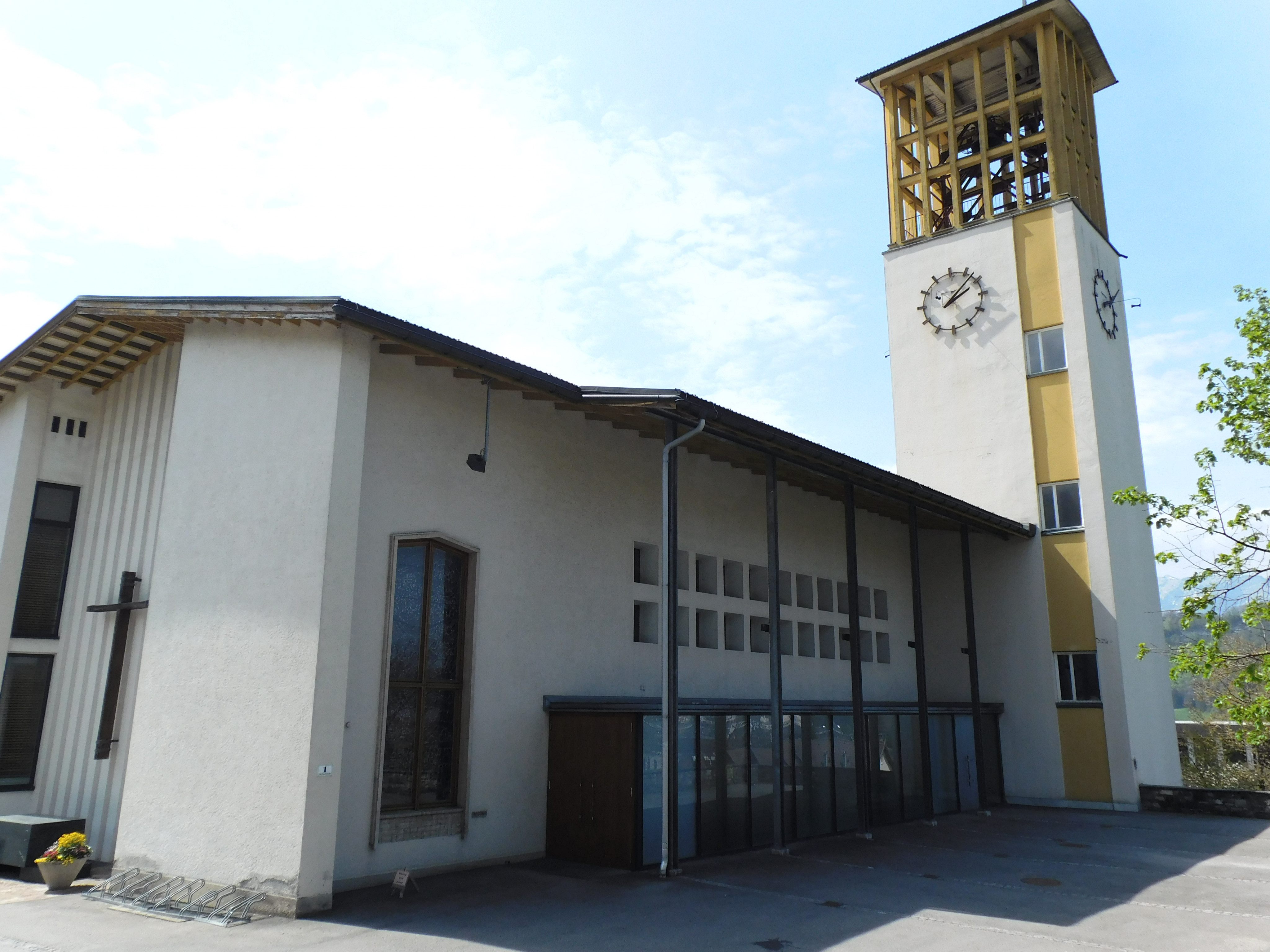 Feldkirch. Die moderne Kirche vereint dabei Elemente aus Stahlbeton und Holz, wobei das Gotteshaus ein Saalbau mit weit vorkragendem Dach darstellt, welches an der Nordseite durch Metallstützen getragen wird. Eine Besonderheit der Tisner Pfarrkirche ist dabei die Gestaltungsweise des Turmes; sein offener Glockenstuhl gewährt eindrucksvolle Einblicke zu den drei Glocken. Zudem ist an der Außenseite der Pfarrkirche ein Denkmal für die Gefallenen der Weltkriege und für politische Opfer des Nationalsozialismus zu finden. Die 22 Glasfenster des Vorarlberger Künstlers Martin Häusle führen dem Betrachter den Kreuzweg Jesu bis hin zur Auferstehung vor Augen und ein weiteres großes buntes Fenster zeigt die irdische und die himmlische Kirche. Im Jahre 1999 wurde in Tisis eine Renovierung und Umgestaltung des Innenraums durchgeführt, wobei ein weiter Metallvorhang eingezogen wurde, der eine Aufteilung in einen großen Raum und in eine Art Kapelle zur Folge hat.
