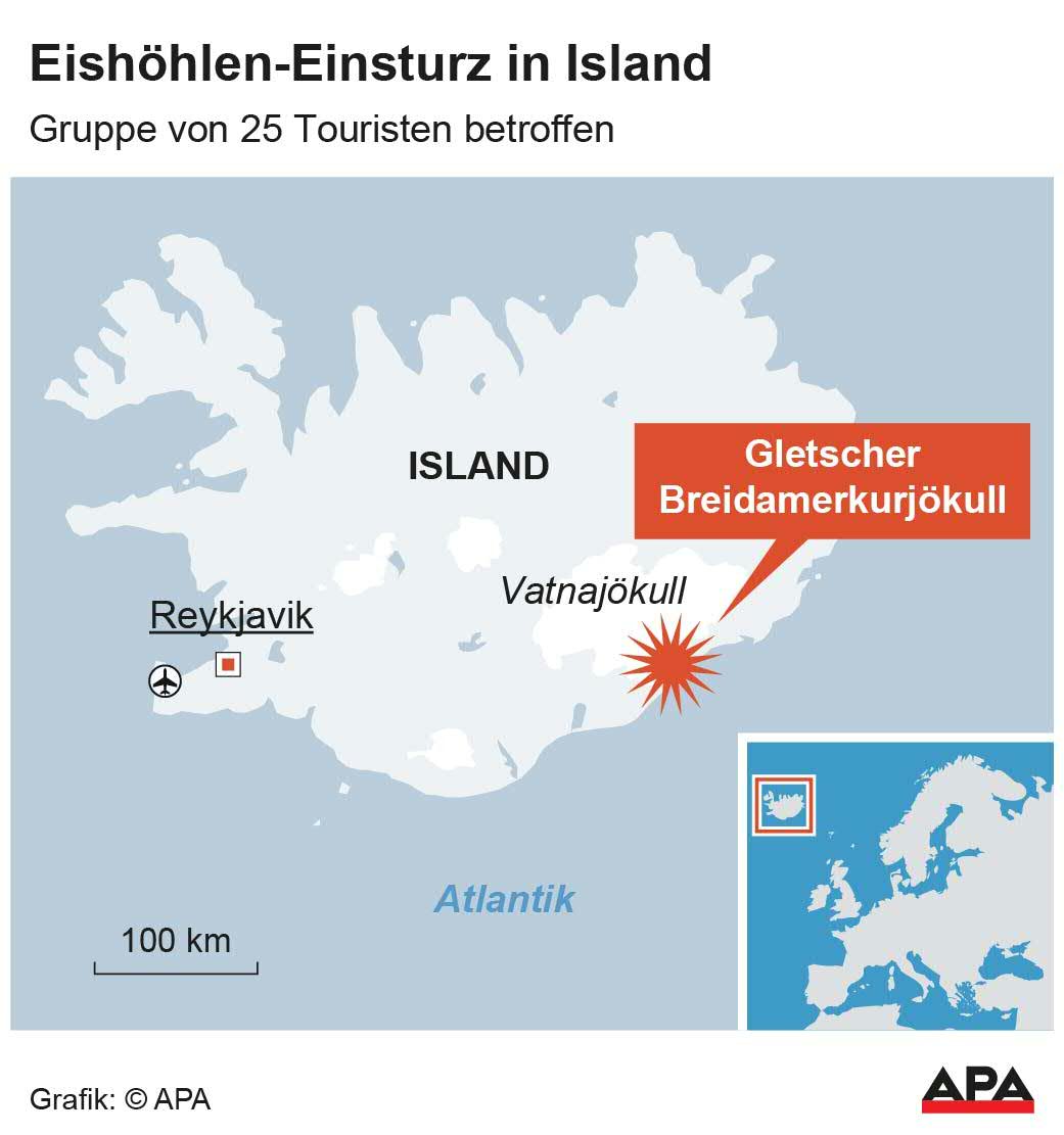 Die Suche nach zwei vermeintlich vermissten Touristen ist abgebrochen worden. Es sei niemand mehr unter dem Eis eingeschlossen, teilte die Polizei auf Facebook mit. In Wirklichkeit wären nur 23 Menschen Teil der betroffenen Reisegruppe gewesen, nicht 25 wie bisher angenommen. Es scheine klar, dass bei der Registrierung für die Tour etwas nicht korrekt gewesen sei und es widersprüchliche Angaben zur Anzahl der teilnehmenden Personen gegeben habe. Man habe es dennoch für wichtig gehalten, die Suche so lange fortzusetzen, bis klar geworden sei, dass sich niemand unter dem Eis befunden habe. Der Einsatz sei damit abgeschlossen. Das Unglück hatte sich am Sonntag auf dem Gletscher Breidamerkurjökull in der Nähe der Gletscherlagune Jökulsarlon im Südosten Islands ereignet. Wie die Polizei nun mitteilte, handelte es sich um zwei Touristen aus den USA: Der Mann wurde noch vor Ort für tot erklärt, die Frau kam in ein Krankenhaus in Reykjavik.