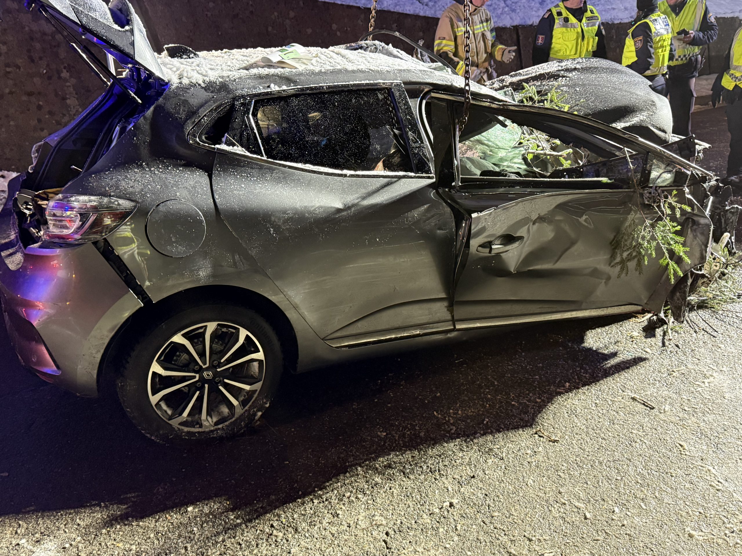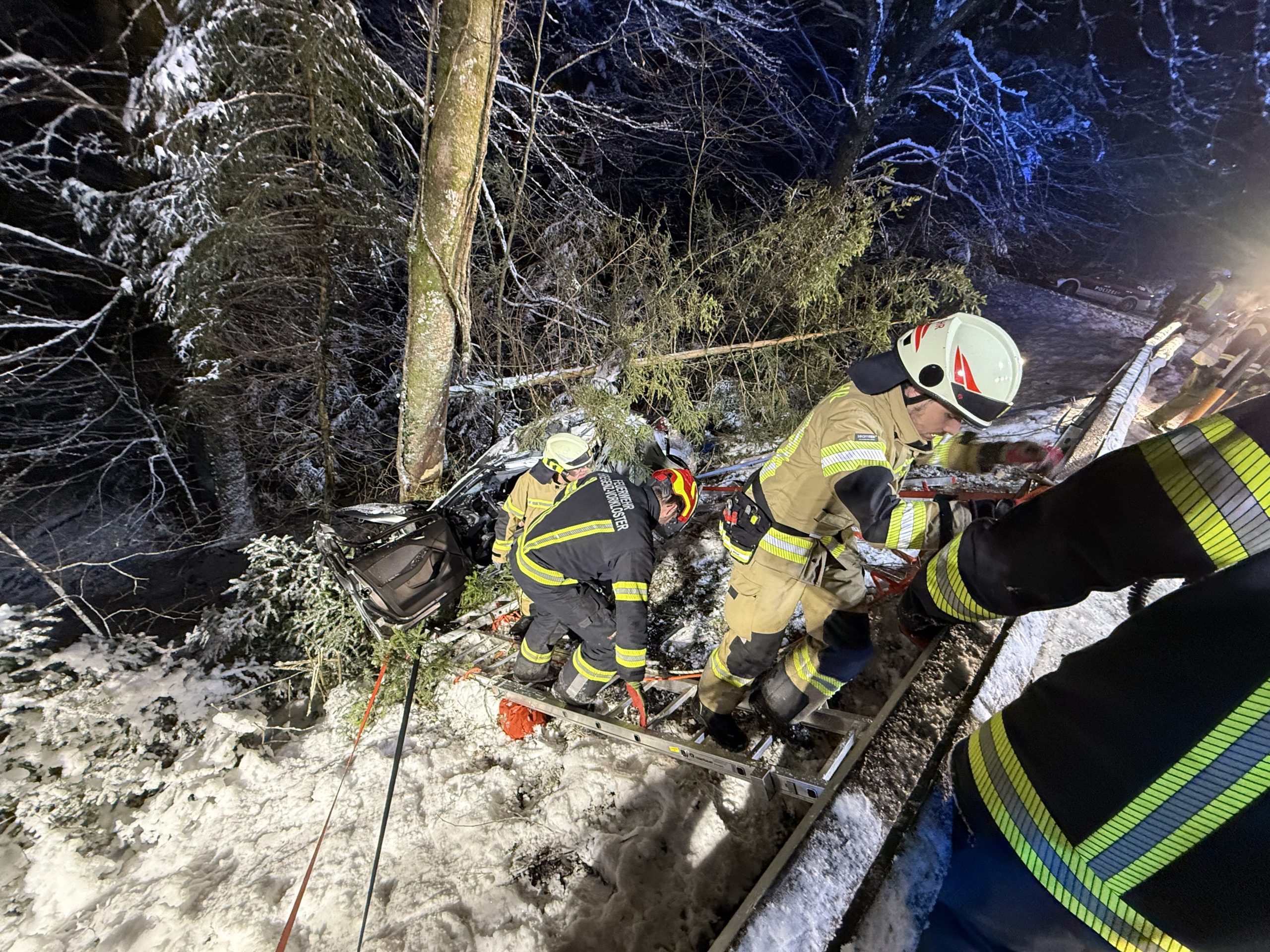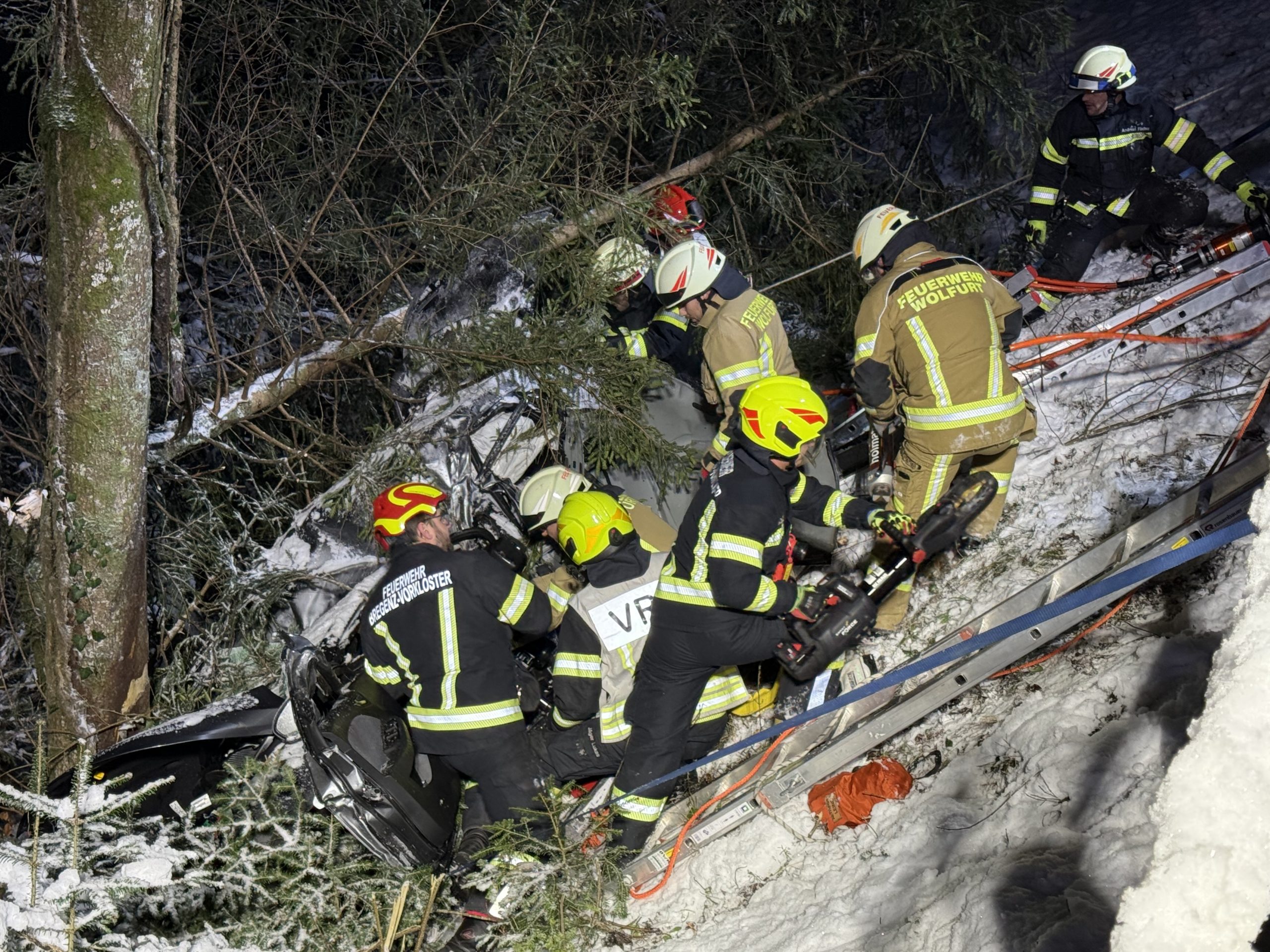 Dabei passierte das Fahrzeug knapp die Leitschiene, geriet auf eine schneebedeckte Fläche und fuhr auf eine Kuppe zu. In der Folge stürzte der Wagen in ein steil abfallendes Tobel. Nach rund 13 Metern prallte das Fahrzeug mit voller Wucht gegen einen Baum.