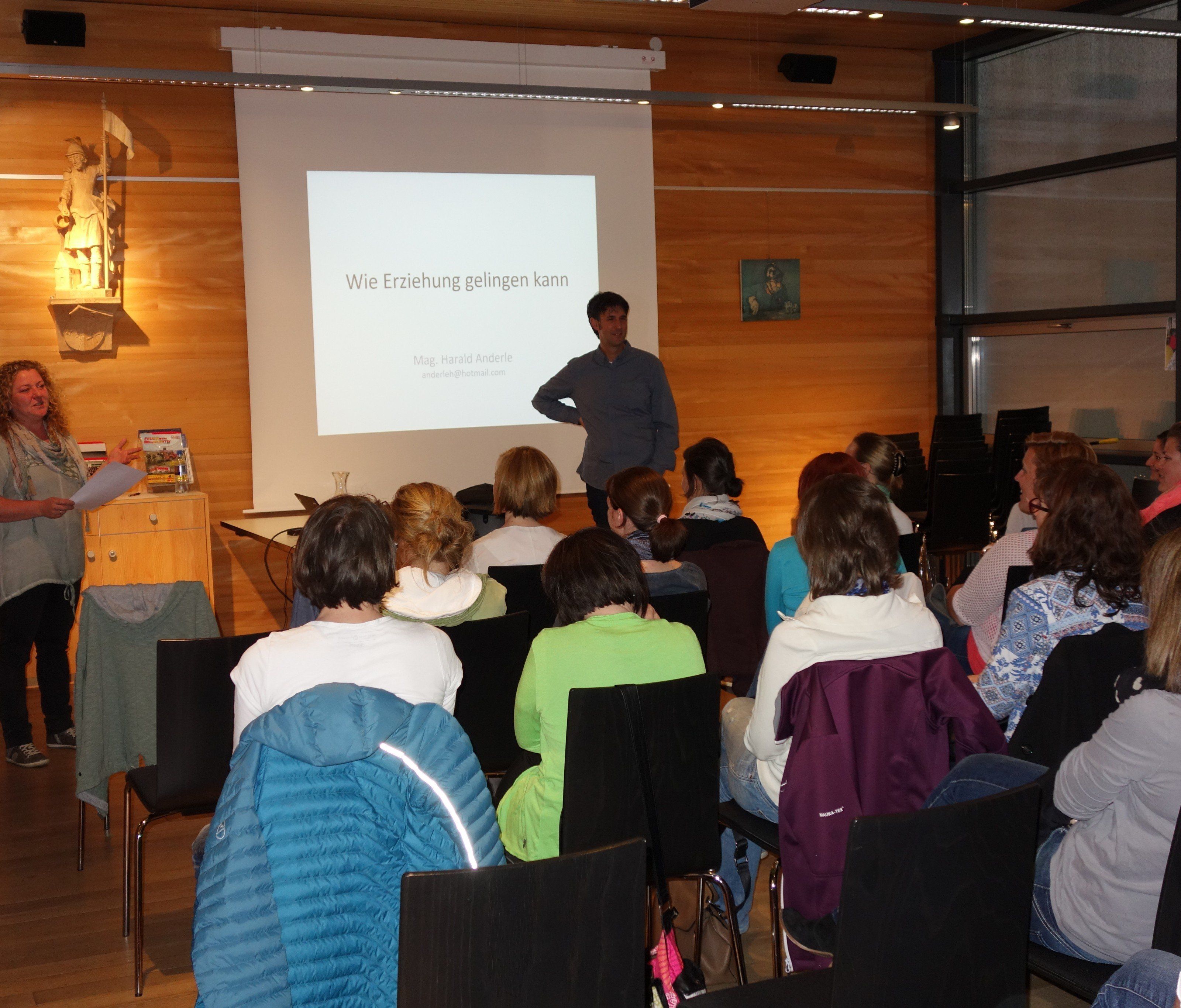 Die Zuhörer folgten den Ausführungen des 47-jährigen Psychologen und Psychotherapeuten sehr interessiert und diskutierten in der anschließenden Fragerunde mit. An vielen praktischen Beispielen aus seinem Vaterleben und seiner Arbeit im Vorarlberger Kinderdorf konnte Harald Anderle vermitteln, wie eine offenen Beziehung, ein ständiges „am Ball bleiben“ die Kinder für das spätere Leben stärkt. Er machte auch Mut, sich als Eltern klar zu positionieren.