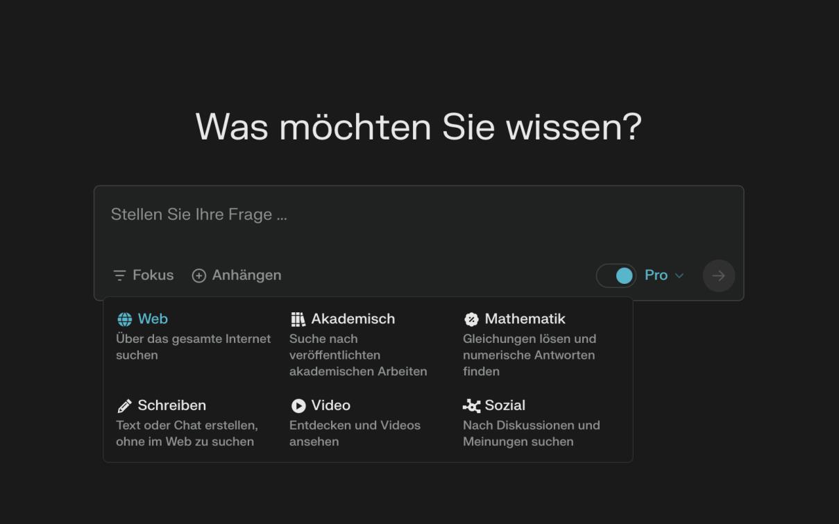Dank der "Focus"-Funktion kannst du gezielt in verschiedenen Bereichen suchen, zum Beispiel nur in akademischen Quellen – perfekt für Hausarbeiten und Recherchen. Per Drag & Drop kannst du Dokumente hochladen und die KI analysiert diese sofort für dich. Mit der kostenpflichtigen Pro-Version kannst du noch mehr Anfragen tätigen und hast zusätzlich Zugriff auf die neuesten KI-Modelle von verschiedenen Anbietern, was besonders bei komplexen Fragestellungen hilfreich ist.