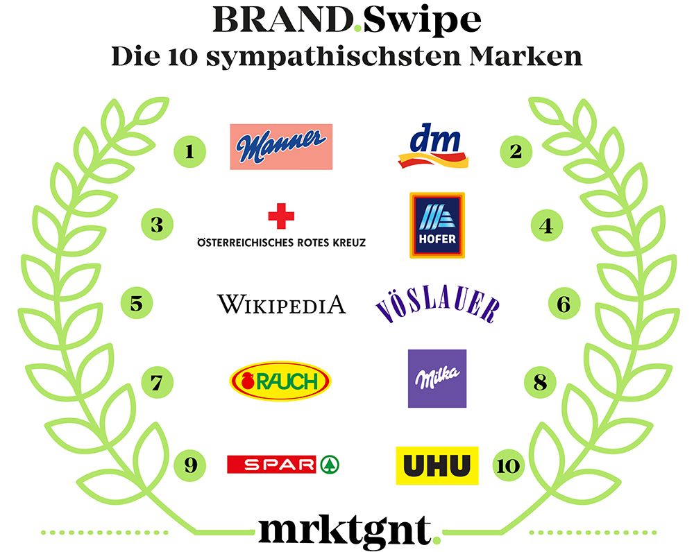 1131 Marken wurden von BRAND.Swipe unter die Lupe genommen. Neben Altbewährten finden sich auch Newcomer und Überraschungen auf den Top-Platzierungen. Eins vorweg: Auch heuer konnte sich das Traditionsunternehmen Manner den Titel der beliebtesten Marke sichern.