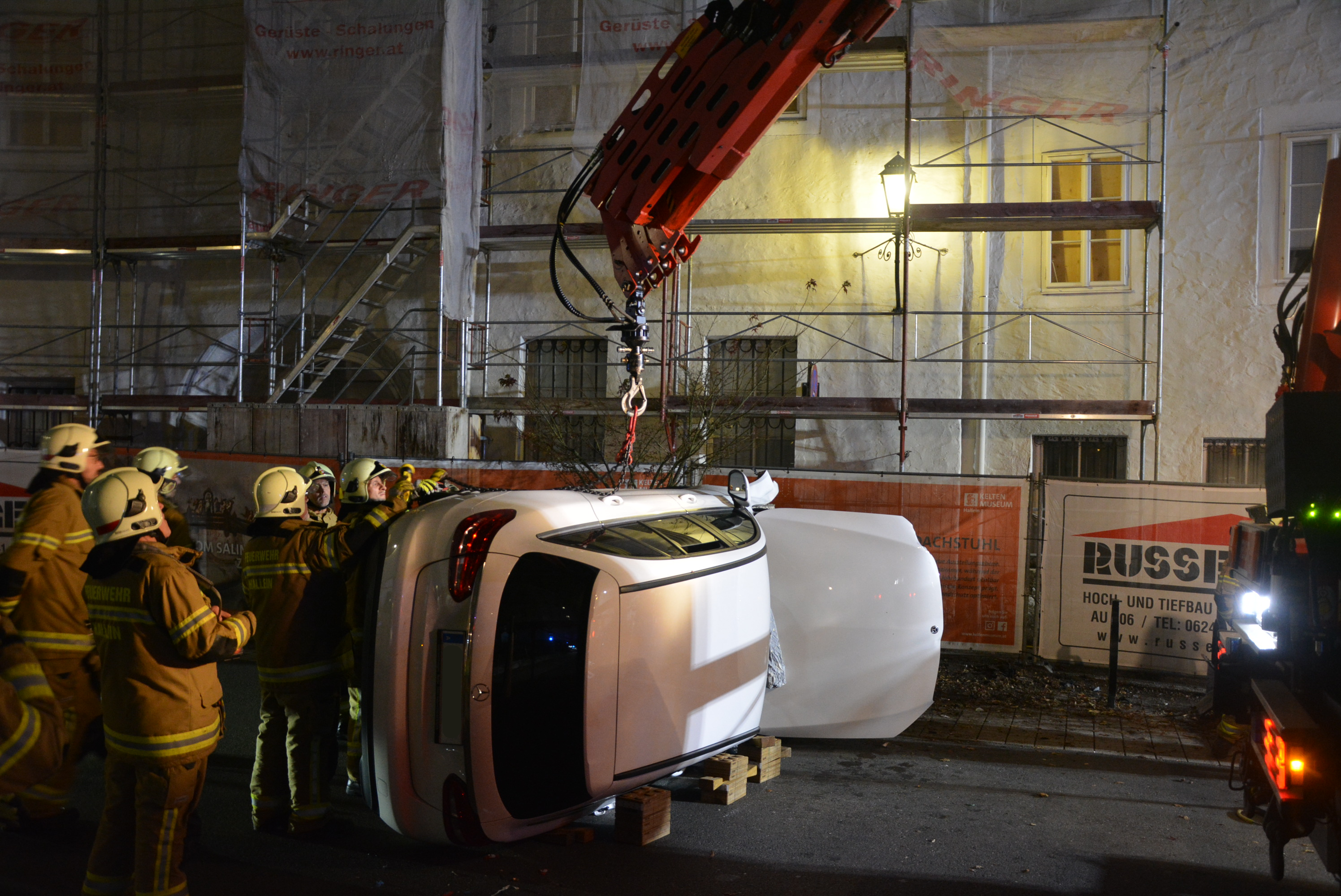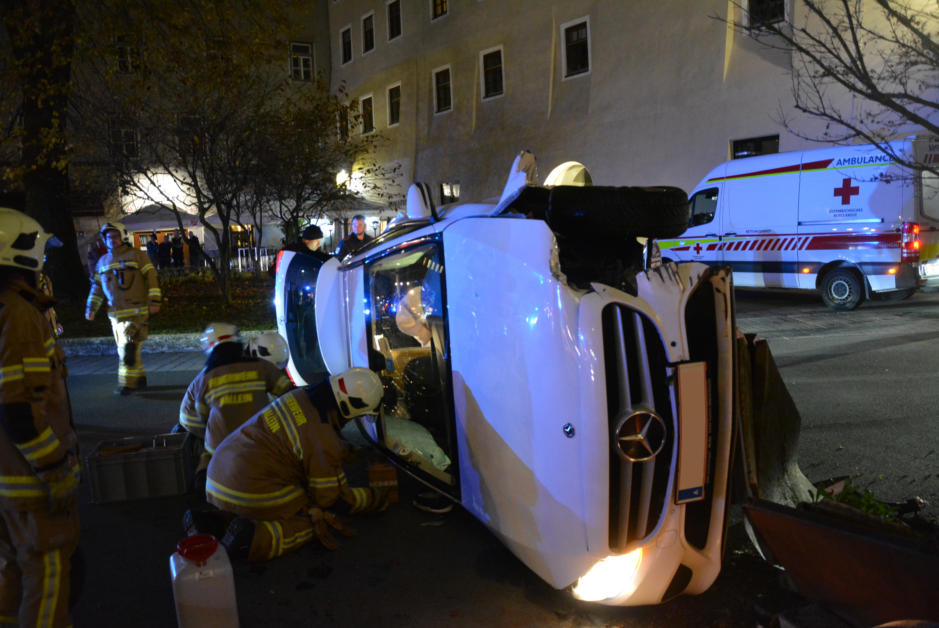 Zum Glück blieb der Lenker bei dem Unfall nur leicht verletzt. Noch bevor die Einsatzkräfte am Unfallort eintrafen, halfen Passanten dem jungen Mann aus dem umgestürzten Auto. Die alarmierte Feuerwehr stellte den beschädigten Mercedes mit einem Kran wieder auf die Räder, damit er von einem Abschleppdienst abtransportiert werden konnte.