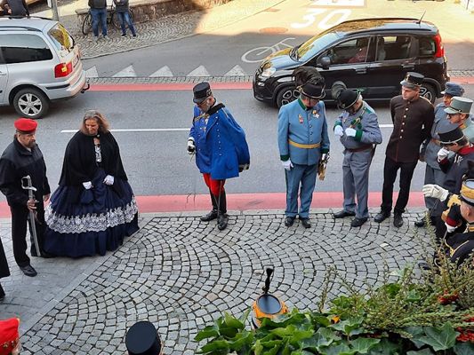 Bei sonnigem Wetter versammelten sich die Gäste beim Kriegerdenkmal. Nach der Begrüßung durch Oberst d. Kav. Helmuth A. Küng, stiegen wir die Treppe hinauf zum Kriegerdenkmal. Im Anschluss flanierten wir durch die Altstadt. Als Gesandter Austria Imperialis überbrachte kuk Gen Mjr Robert Jordan, die Grußbotschaft der Kaiserlichen Hoheiten Herta Margarete und Sandor von Habsburg-Lothringen. Zur Einstimmung hielt Zugsführer d. Kav. David Eslbauer einen Bildvortrag über den letzten Regimentsinhaber des Husarenregiment Nr. 15 - SKKH Erzherzog Franz Salvator.