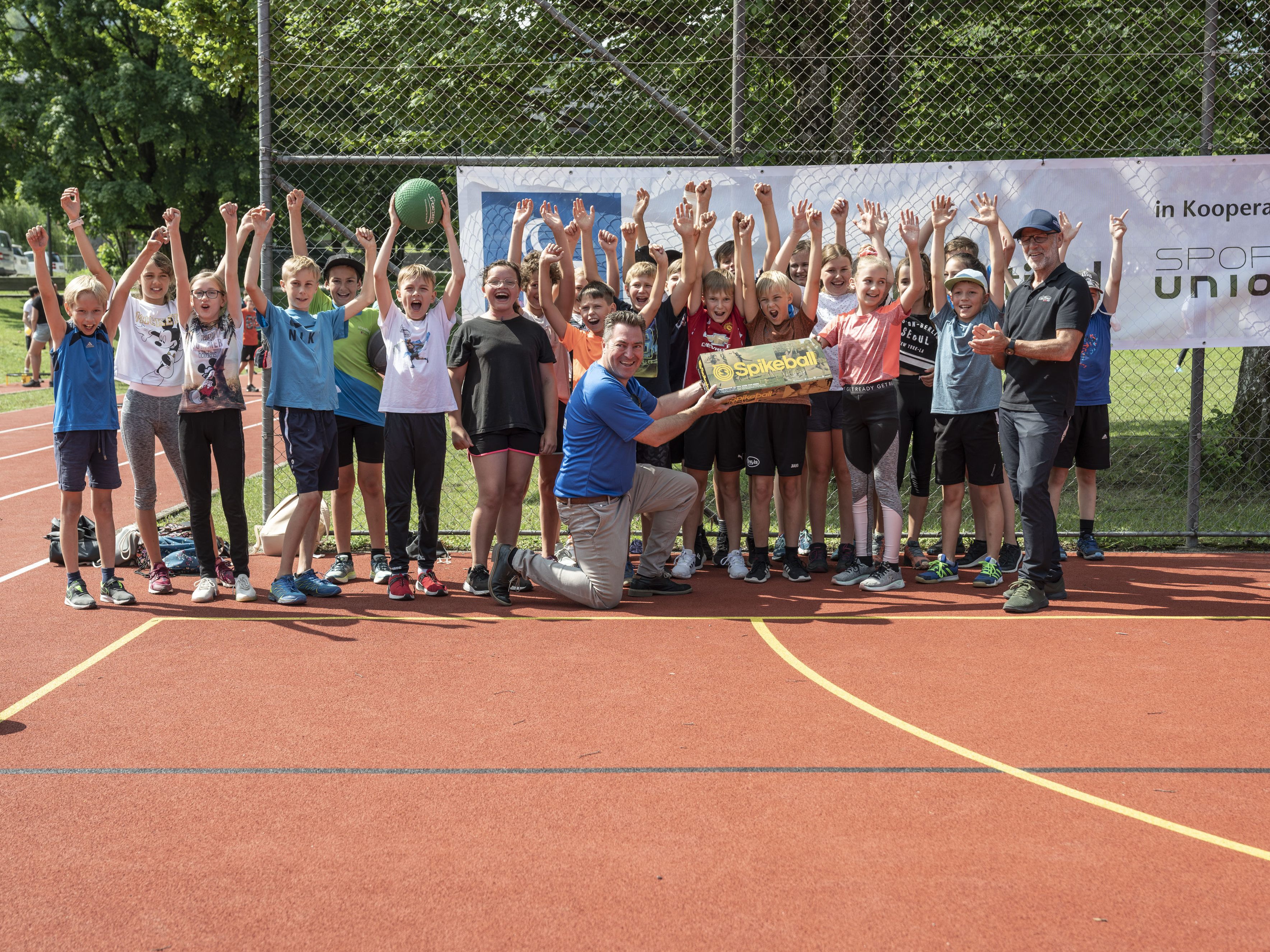 Insgesamt 350 11- bis 15-jährige Schülerinnen und Schüler aus der Mittelschule Egg waren beim UNIQA Trendsportfestival 2021 in Vorarlberg dabei. Das Event fand unter der Berücksichtigung der geltenden Corona-Bestimmungen statt. An mehreren Standorten sorgten verschiedene Stationen für Action und Spaß. Zu den zahlreichen Möglichkeiten gehörten unter anderem Ultimate Frisebee, Spikeball, Airtrack, Slackline, Beachvolleyball und vieles mehr. 4 Klassen der Mittelschule bekamen ein Spikeballset von UNIQA Landesdirektor Markus Stadelmann, Fachinspektor für Bewegungserziehung und Sport Conny Berchtold, Schulsportreferent Christoph Neyer und SPORTUNION Vorarlberg Geschäftsführer Sebastian Gmeiner überreicht.