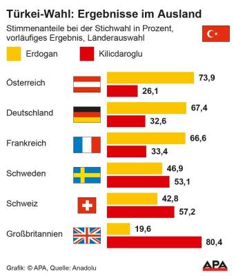 Mit rund 52 Prozent der bei der Stichwahl abgegebenen Stimmen überflügelte Erdogan seinen Kontrahenten Kemal Kilicdaroglu knapp. Letzterer monierte mehrfach, dass das Land "den unfairsten Wahlkampf der letzten Jahre erlebt" habe und "alle Staatsmittel für eine politische Partei mobilisiert und einem Mann zu Füßen gelegt" wurden.