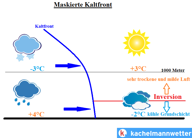 Für gewöhnlich bringen Kaltfronten kühlere Luft mit sich, wie der Name schon sagt. Es gibt aber eine Ausnahme: die "maskierte Kaltfront". Mit ihr wird es in bodennahen Schichten wärmer statt kälter. Maskierte Kaltfronten treten fast ausschließlich in den Wintermonaten auf.