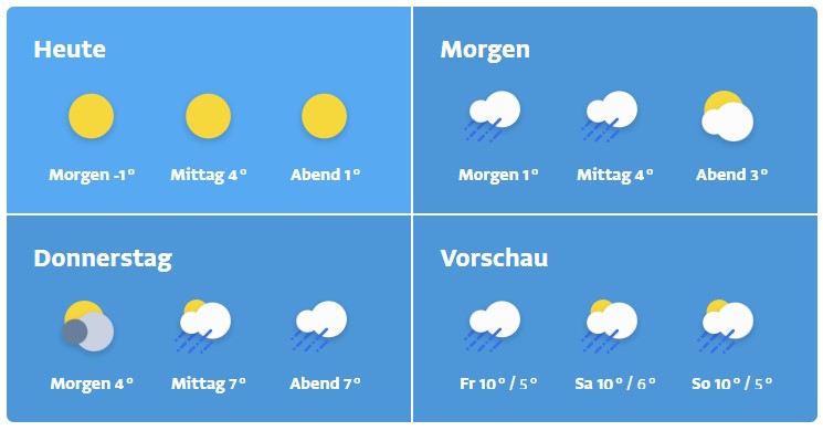 Teils windig und mild. Oft überwiegen die Wolken, die höchstens noch kurz aufhellen. Dazu kann es vormittags vor allem im Bergland schon regnen bzw. schneien, ab etwa Mittag ist verbreitet mit mäßigem Regen zu rechnen. Die Schneefallgrenze steigt von unter 1000 auf 1.400 Meter. Die Tiefstwerte liegen bei -2 bis +2 Grad, die Höchstwerte bei 5 bis 10 Grad.