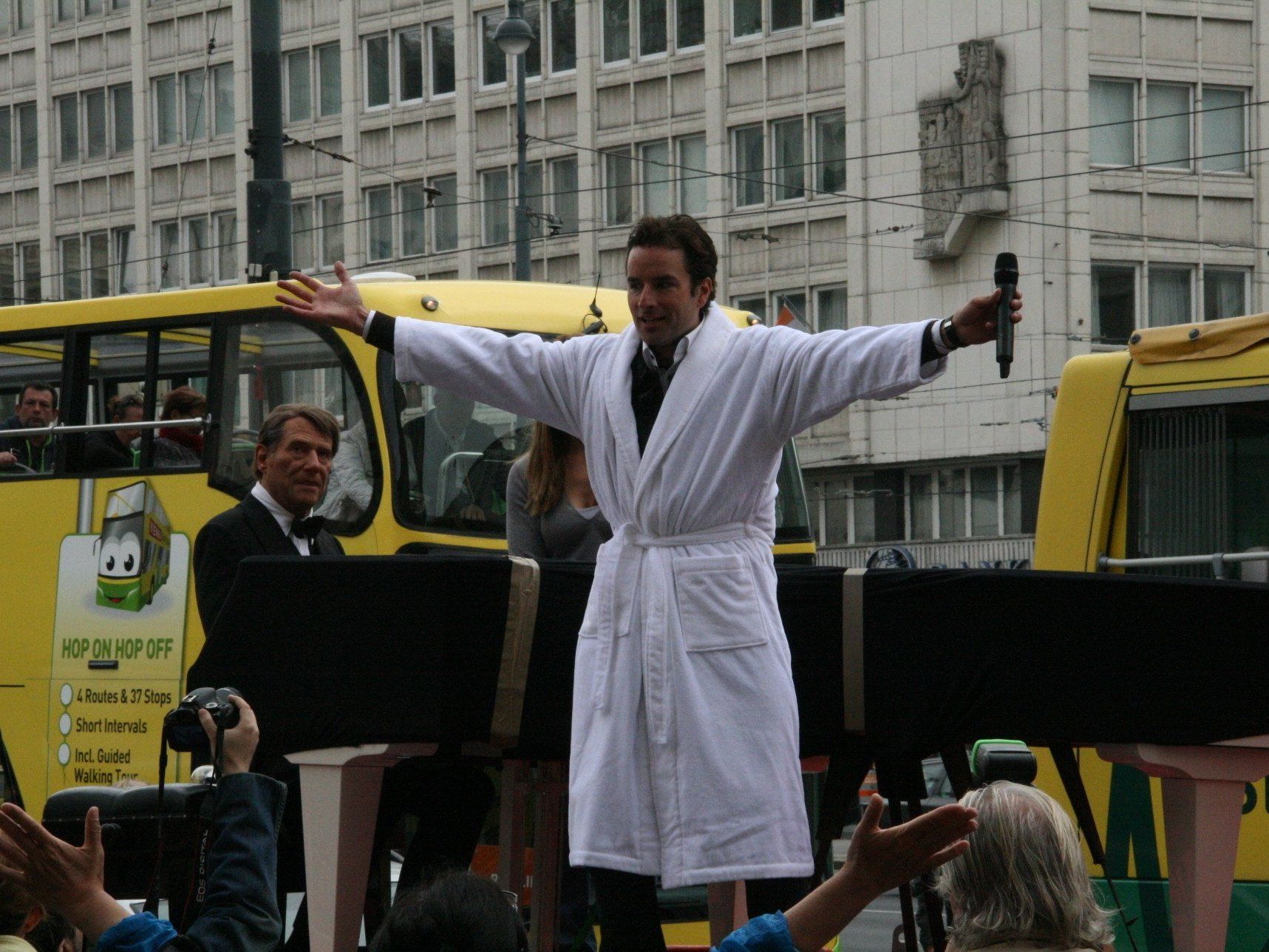 Vor Abmarsch sammelten sich vor der Staatsoper bei prächtigem Herbstwetter die Umzugsteilnehmer. Auf einem Musik-Truck war das Geburtstagskind selbst zu bewundern – allerdings nur als Wachsfigur am weißen Bösendorfer. Ein ausdauernd hüftschwingender Moderator mühte sich ab, das – anfangs eher spärlich bebademantelte – Publikum mit hoher Seniorenquote mit mehr oder weniger großem Erfolg zum Massenkaraoke zu animieren. Mutige konnten sich via A-capella-Challenge an Hits wie “17 Jahr, blondes Haar”, “Mit 66 Jahren” oder “Aber bitte mit Sahne” versuchen und entsprechende Frotteeware abstauben. Ebenfalls auf der improvisierten Bühne sorgte ein sichtbar professionelles Jürgens-Double samt Frack und rotem Stecktuch für stimmliche Unterstützung.