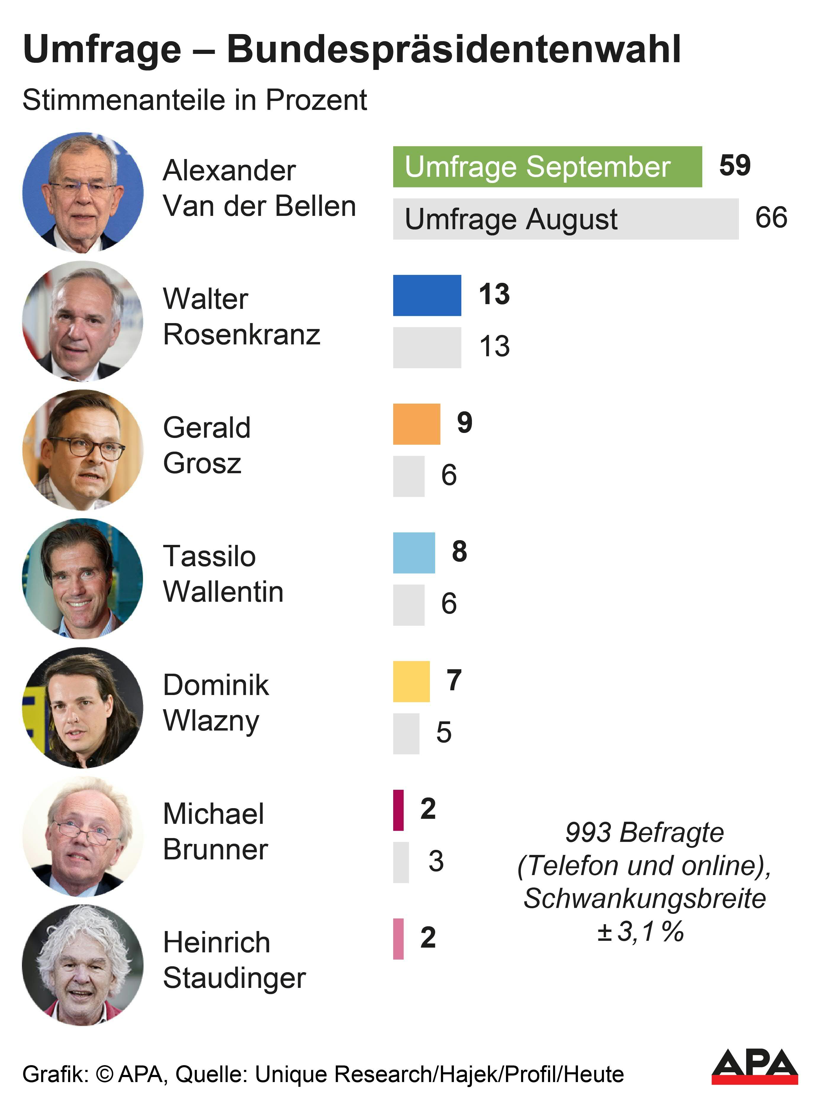 Platz Zwei wird derzeit für den FPÖ-Kandidaten Rosenkranz ausgewiesen; wie schon im August liegt er bei 13 Prozent. "Walter Rosenkranz kann das FPÖ-Potenzial aktuell nicht ausschöpfen, was auch an der großen Konkurrenz im rechten Lager liegt", insbesondere an Gerald Grosz, meinte Hajek. Der Blogger und frühere FPÖ-/BZÖ-Politiker Grosz konnte in der Umfrage von 6 auf 9 Prozent zulegen. "Der zweite Platz (für Rosenkranz) ist statistisch noch nicht abgesichert, da der Vorsprung auf Grosz nicht signifikant ist", betonte Hajek. Vorteile für Rosenkranz seien, dass auch seine Wählerschaft gut mobilisiert sei und er im Gegensatz zu seinen Mitbewerbern auf die Unterstützung des FPÖ-Parteiapparates zählen könne. Grosz wiederum habe sich mit klarer Linie und Kommunikation gut positioniert. Wer bei der Bundespräsidentenwahl vorne liegt, wird sich zeigen.