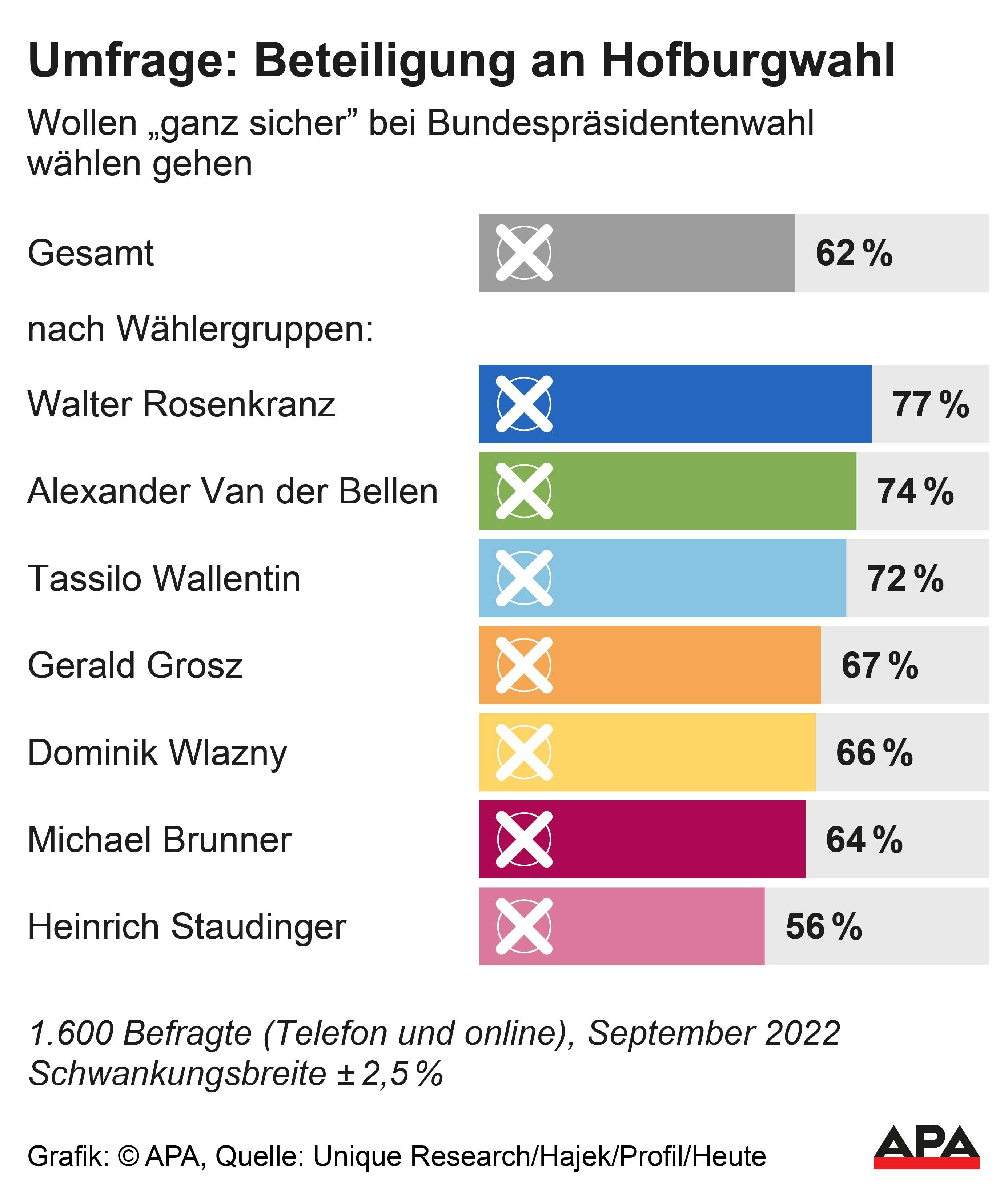 Laut der Hochschätzung würden 59 Prozent der Befragten Amtsinhaber Van der Bellen wählen. Bei einer vergleichbaren "Unique Research"-Umfrage waren es noch 66 Prozent. Diese Verluste seien erwartbar gewesen, erklärte Meinungsforscher Peter Hajek, "weil Mitte August das restliche Mitbewerberfeld noch vage war". Van der Bellen habe "alle Trümpfe in der Hand", analysiert Hajek anhand der Detailergebnisse der Umfrage: Seine Wählerschaft sei "sehr gut mobilisiert" und sei sich auch ihrer Stimmabgabe für Van der Bellen sehr sicher, während das beim Mitbewerb nicht so sei. Zudem könne Van den Bellen auf breite Unterstützung der Wählerschaft von SPÖ, ÖVP, Grünen und NEOS bauen. "Aus heutiger Sicht spricht alles für den Amtsinhaber, eine Stichwahl erscheint unwahrscheinlich - sofern es keine Überraschung im Intensivwahlkampf mehr gibt." Wie sieht es im Hinblick auf den FPÖ-Kandidaten für die Bundespräsidentenwahl, Walter Rosenkranz, aus?