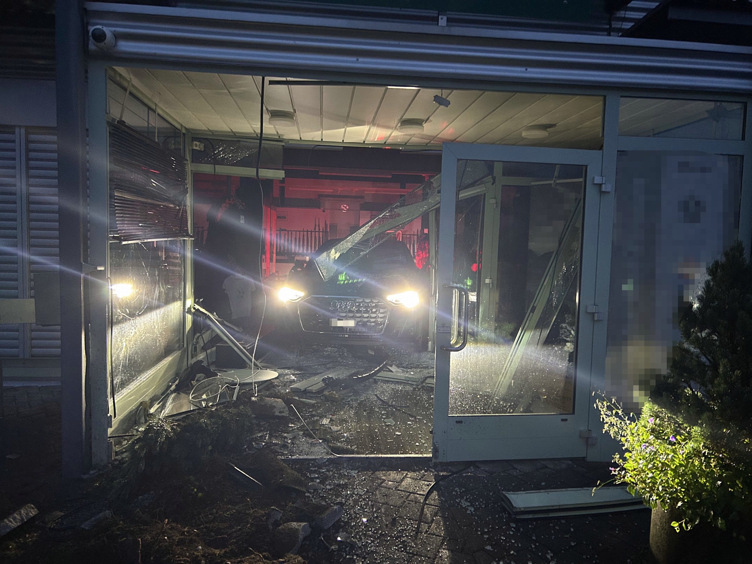 Kurz vor 4:45 Uhr rammte die unbekannte Täterschaft den Eingang des Gebäudes mit einem zuvor gestohlenen Auto, um sich Zutritt in die Räumlichkeiten zu verschaffen.