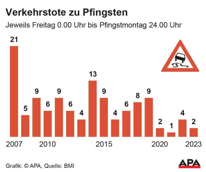 Ein 42-jähriger Motorradfahrer und ein 49-jähriger Mitfahrer in einem Kleintransporter starben am Pfingstwochenende bei Unfällen in der Steiermark und in Oberösterreich. 2022 waren es vier Tote gewesen. Zwei Verkehrstote im Jahr 2023 bedeuten das bisher zweitniedrigste Ergebnis seit Einführung der Statistik im Bundesministerium für Inneres (1967). Die bisher geringste Opferzahl wurde im Jahr 2021 mit einem Getöteten registriert, damals gab es aber noch zahlreiche Corona-Maßnahmen. Zum Vergleich dazu mussten in den bisher schlimmsten Jahren 45 Tote (1979) und 44 Tote am Pfingstwochenende 1984 beklagt werden.