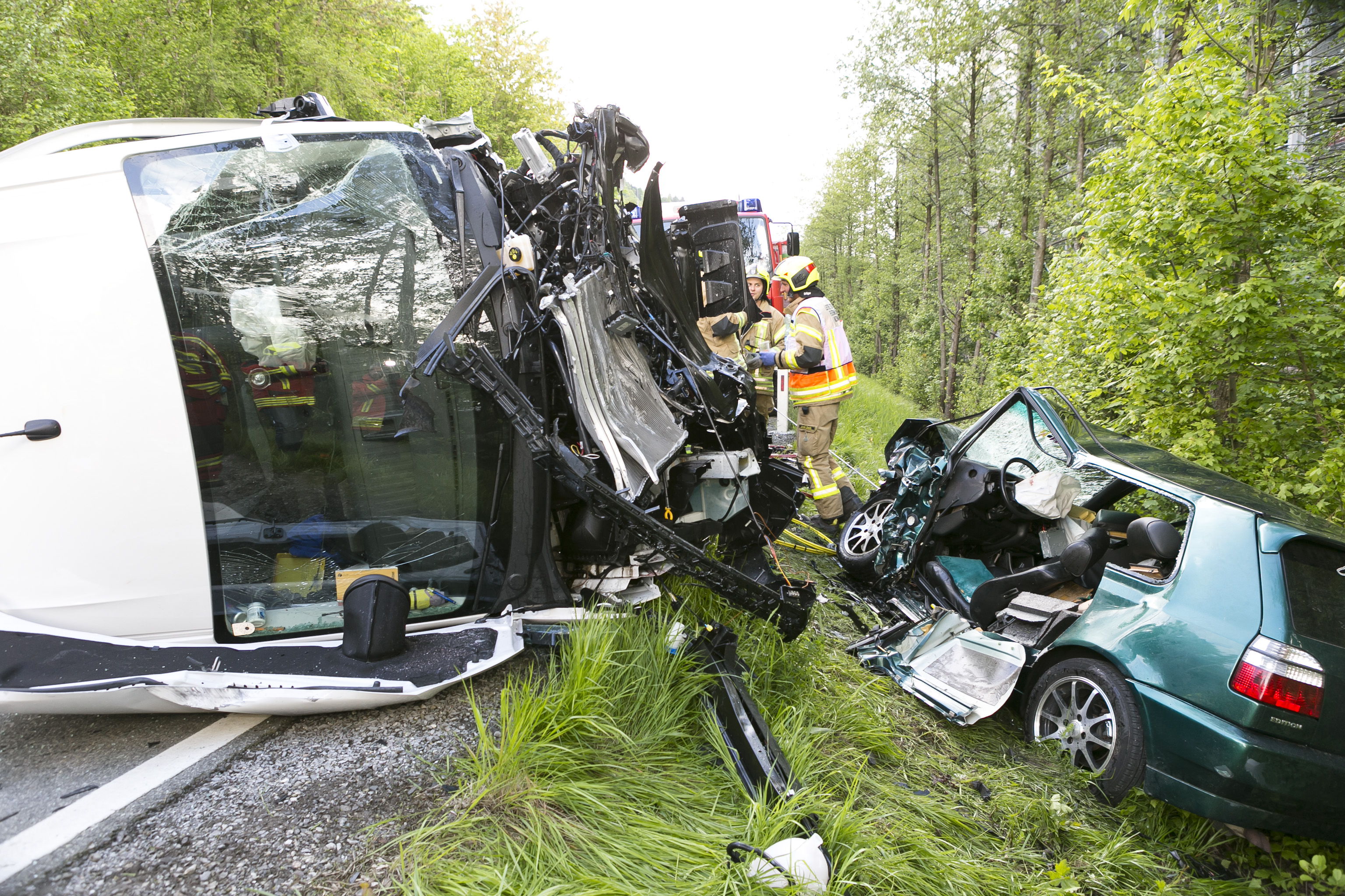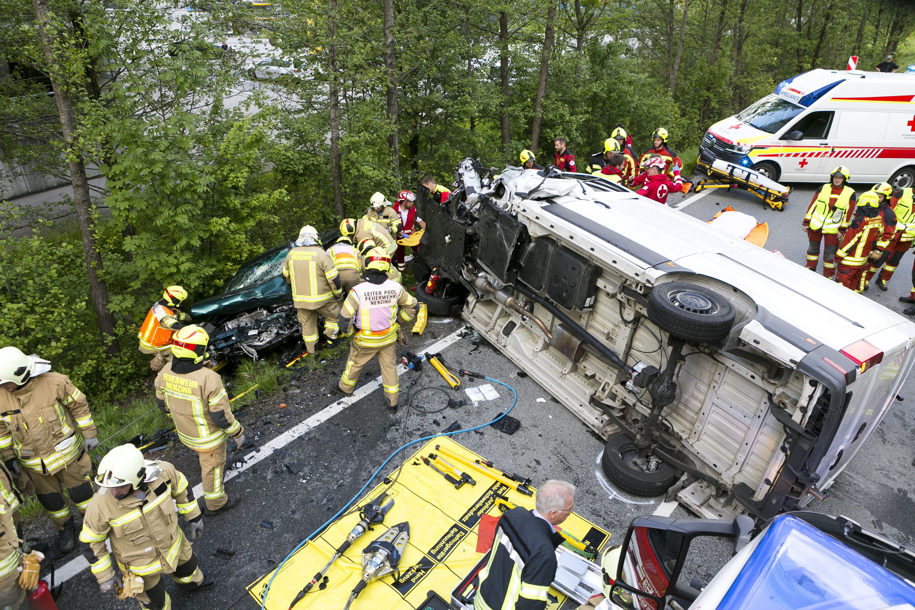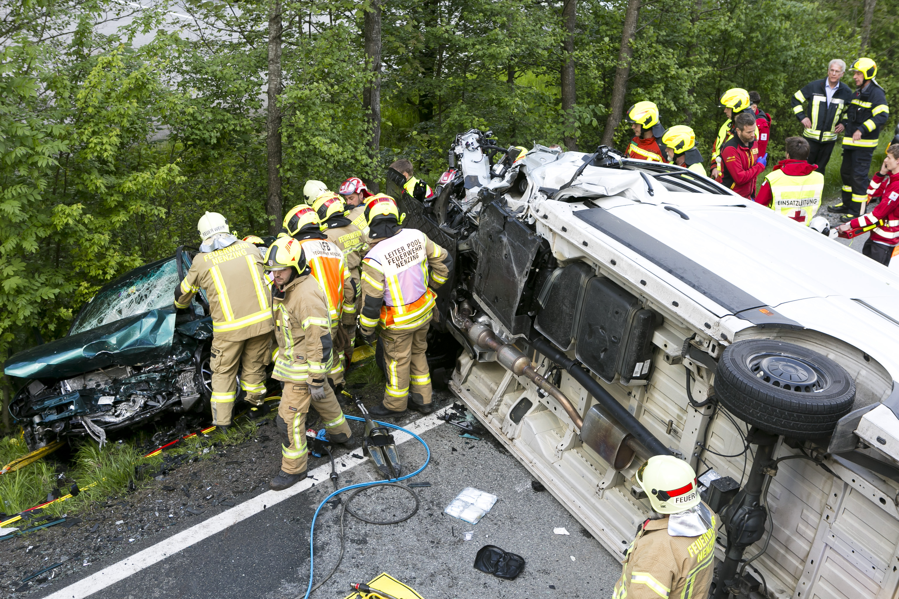 Der Kastenwagen geriet auf die Gegenfahrbahn und stieß frontal mit einem zweiten Pkw zusammen, bevor er umkippte und die Fahrbahn blockierte.