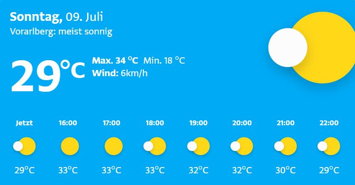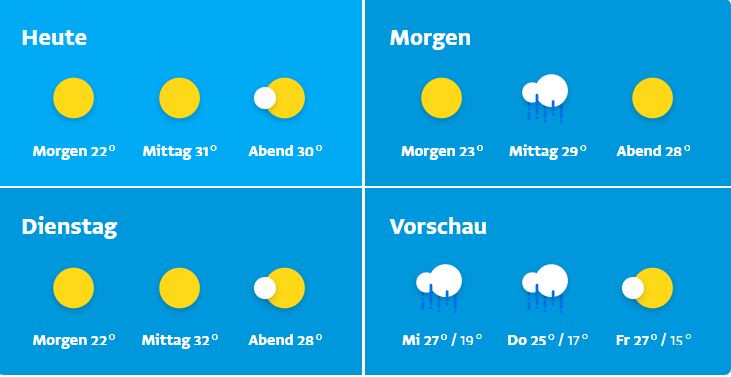 Der Sonntag bringt weiterhin sonnige Verhältnisse und hochsommerliche Hitze. Die Quellungen über den Bergen bleiben harmlos, Gewitter sind keine zu erwarten. Höchstwerte: 29 bis 34 Grad. Kommende Nacht: Meist verlaufen der Abend und die Nacht trocken und klar. Sehr mild mit Tiefstwerten von 15 bis 20 Grad.