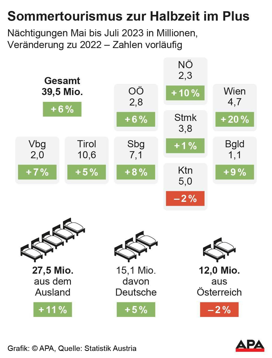 Indiz für den insgesamt positiven Trend ist die Entwicklung im Juli, nach August traditionell der zweitwichtigste Sommermonat im Tourismus. Auf den Juli entfällt in der Regel gut ein Viertel aller Nächtigungen des Sommerhalbjahres. Heuer waren es 18,7 Millionen und damit um 4,2 Prozent mehr als im Juli 2022. Ebenso gestiegen ist die Zahl der Gästeankünfte in österreichischen Beherbergungsbetrieben (plus 5 Prozent auf 5,56 Millionen).