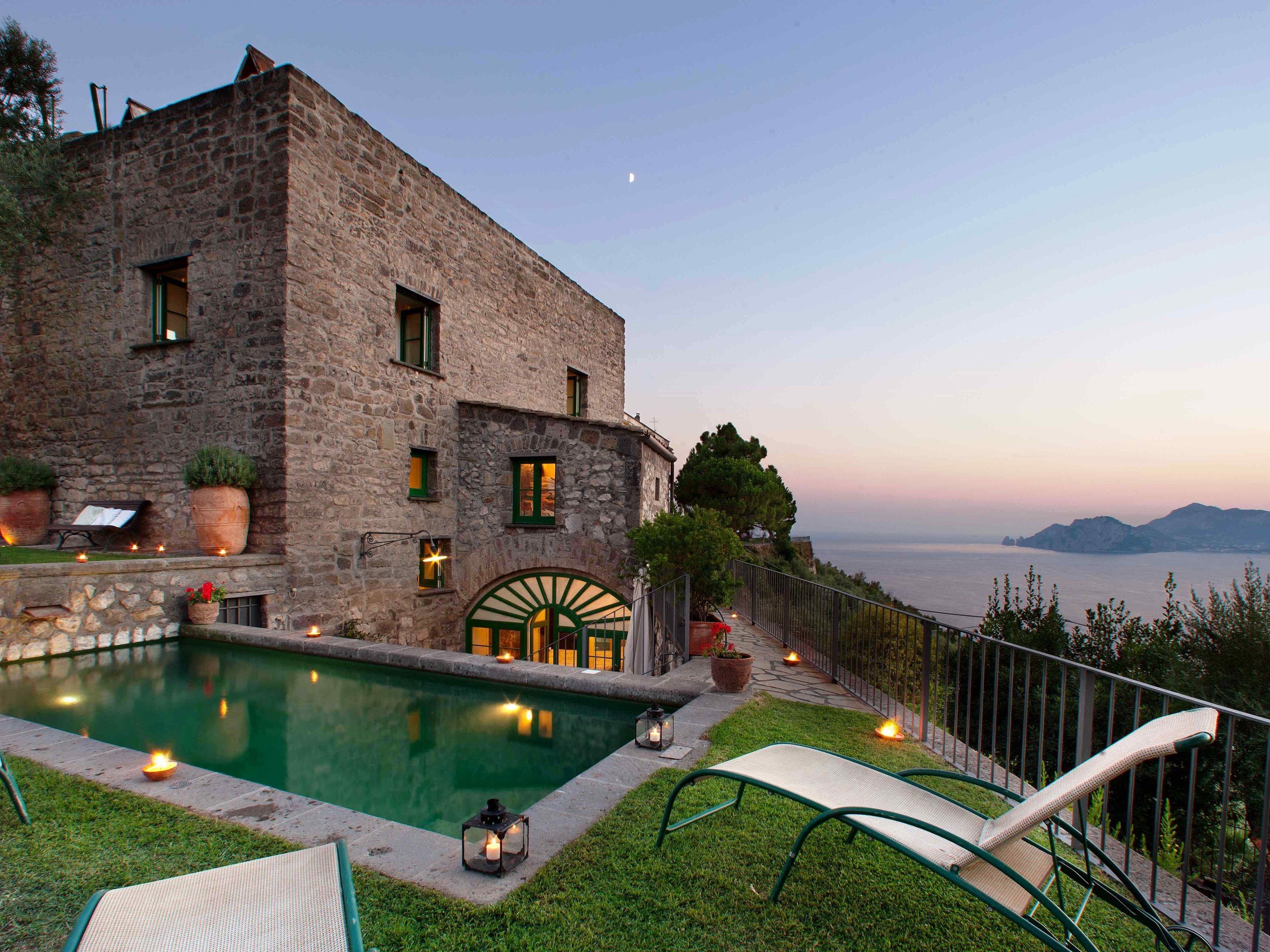 Villa L´Annunziata. Diese Villa liegt ums Eck der traumhaften Amalfiküste. Highlights sind der Pool mit den Sprudelliegen und die Terrasse unter den Weinreben, beides mit Blick auf die gegenüberliegende Insel Capri. Die Villa bietet Platz für bis zu 14 Gäste, die Zimmer sind auf das Haupthaus und zwei Nebengebäude aufgeteilt. Ab ca. 200 € pro Person und Woche.