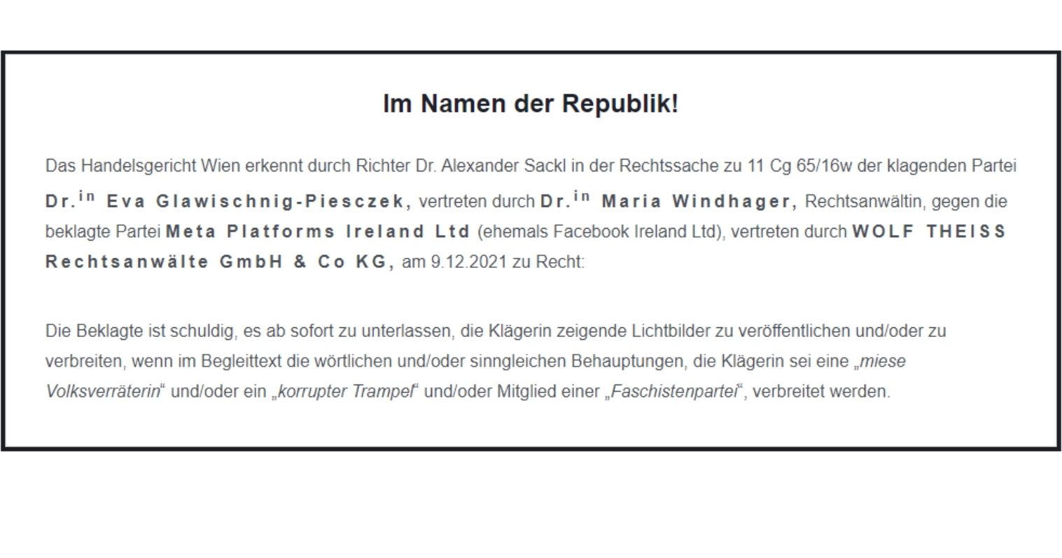 Das handelsgericht Wien hat entschieden, dass die beleidigenden Kommentare auf Facebook gegen die ehemalige Grünen-Chefin Eva Glawischnig gelöscht und das Urteil veröffentlicht werden müssen.