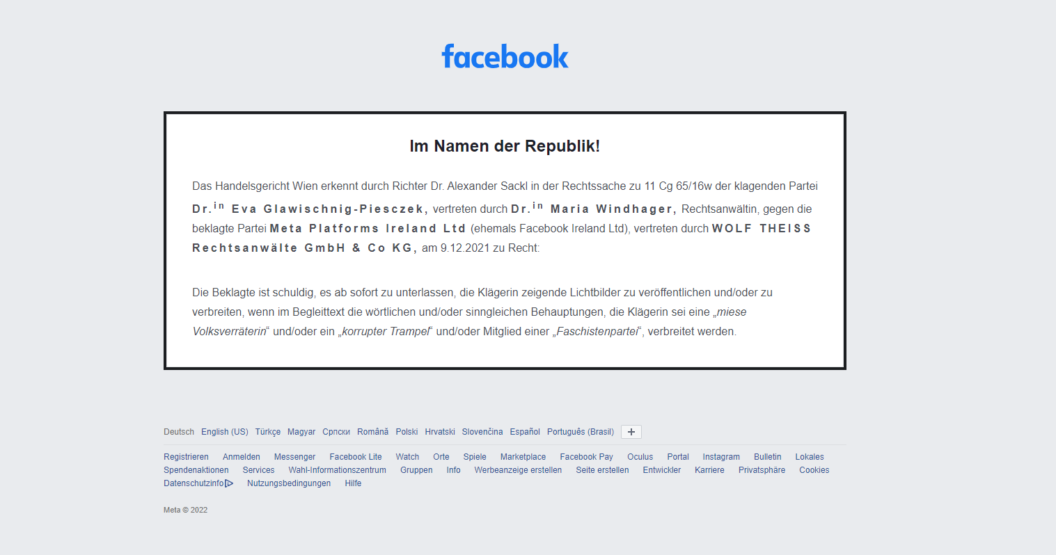 Facebook veröffentlichte das Urteil bereits, jedoch nur in Österreich