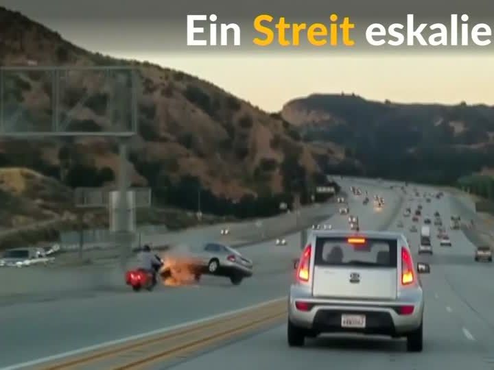 Aus unklaren Gründen trat der Biker während des Überholens in die Seite des Autos. Der Fahrer des Pkws rastete daraufhin offenbar völlig aus und versuchte den Motorradfahrer zu rammen. Dabei verlor er die Kontrolle über das Fahrzeug, prallte zunächst in die Mittelplanke und schleuderte dann quer über die Fahrbahn. Dadurch kam es zu einer Kollision mit einem weiteren Pkw, der sich daraufhin überschlug. Der Biker überstand die Situation wie durch ein Wunder unbeschadet und begann Fahrerflucht. Er wird von der Polizei gesucht.