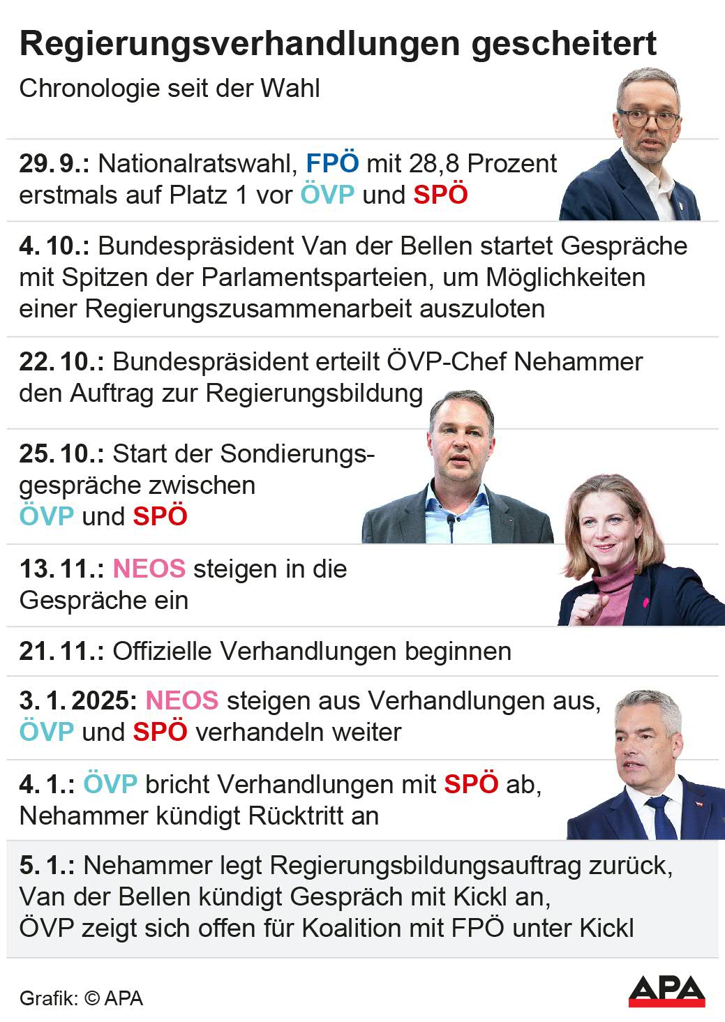 Über das Scheitern der Verhandlungen zwischen ÖVP, SPÖ und NEOS zeigte sich der Bundespräsident überrascht. "Lange wurde der Eindruck vermittelt, als gäbe es eine gute Basis. Selbst nach dem Ausstieg der NEOS wurde mir vermittelt, dass eine Einigung möglich sei". Für viele sei das Scheitern nun "eine große Enttäuschung", und "wie Sie alle wissen, das war nicht mein Wunsch".