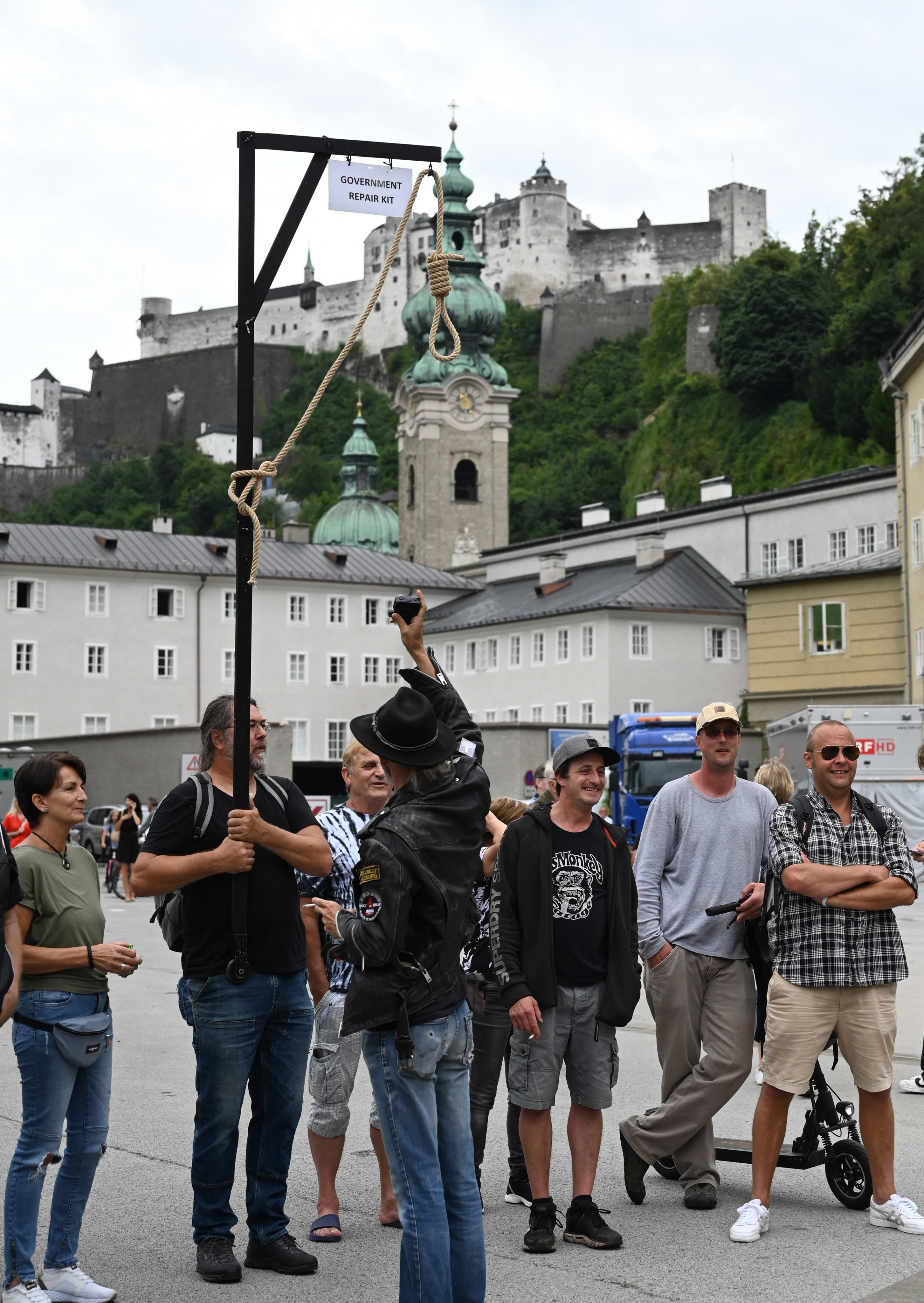 Auf dem Platz vor dem Festspielhaus waren am Dienstag mehrere Personen anwesend, die als Henker verkleidet auftauchten - inklusive Galgen. Auf Postern war der Spruch "Government Repair Kit" zu lesen - auf Deutsch: Reparaturset für die Regierung.