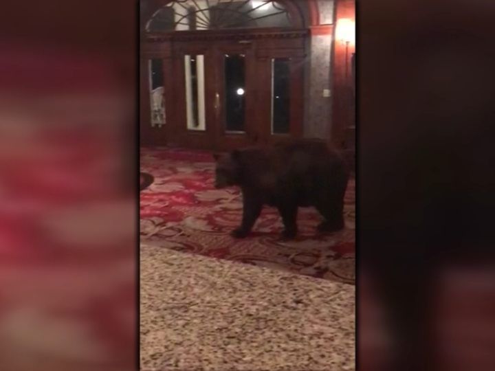 Ein Bär inspiziert in aller Ruhe in den frühen Morgenstunden eine Hotel-Lobby im US-Bundesstaat Colorado.