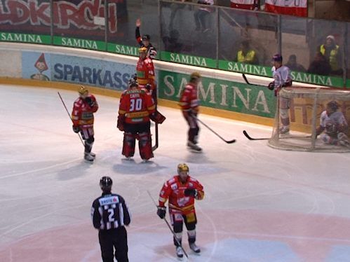 Bei dieser Aktion der angriffslustigen Adler landet Saringer statt dem Puck im VEU- Kasten.