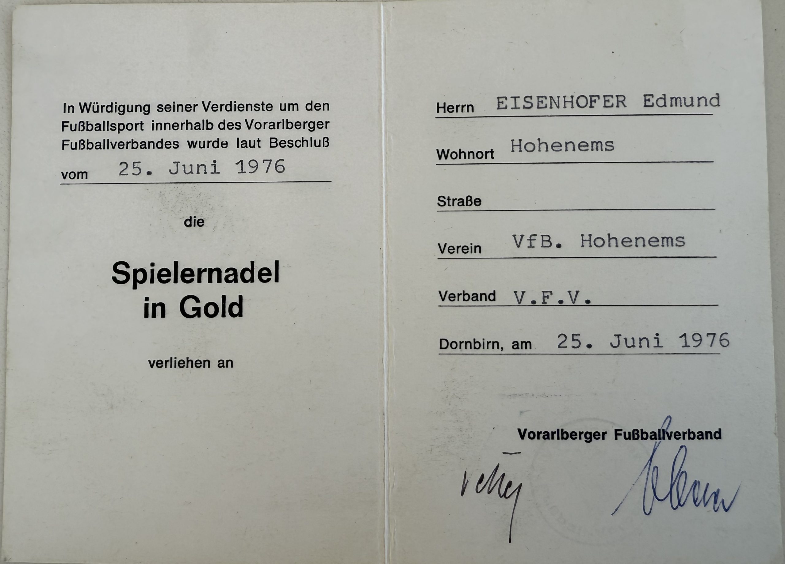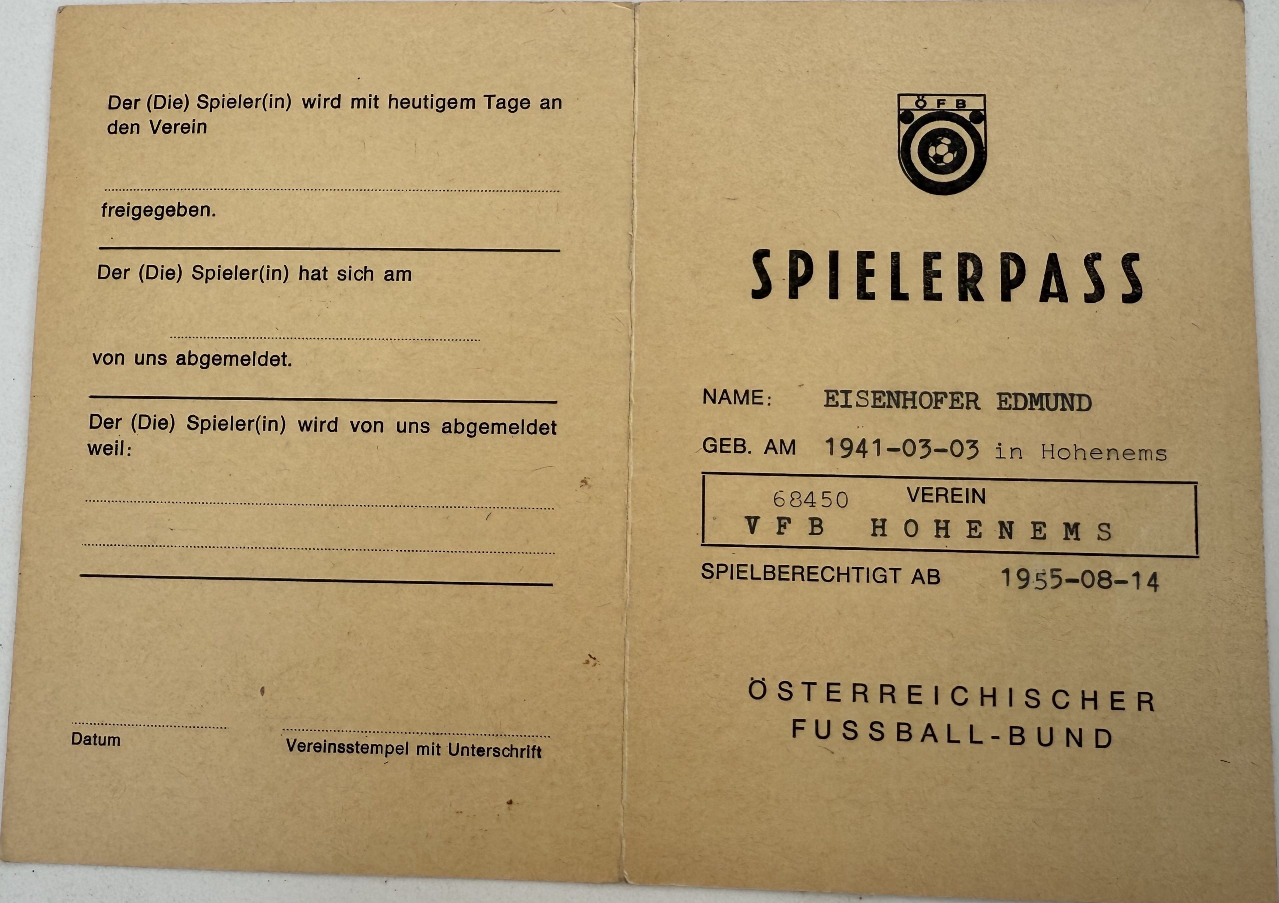 Der Fußball war Edmund Eisenhofers große Liebe. Seine Brötchen aber verdiente er in einer Stickerei in Hohenems – zuständig für Versand und Zollabwicklung. Und wenn abends Zeit blieb, schrieb "Schlager Edi" Lieder. Eines über seine Heimatstadt Hohenems. Ein anderes als Parodie auf den "Ski-Twist" von Hansi Hinterseer – umgedichtet zum "VfB-Twist". Auch das ist Edi: humorvoll, heimatverbunden, kreativ.