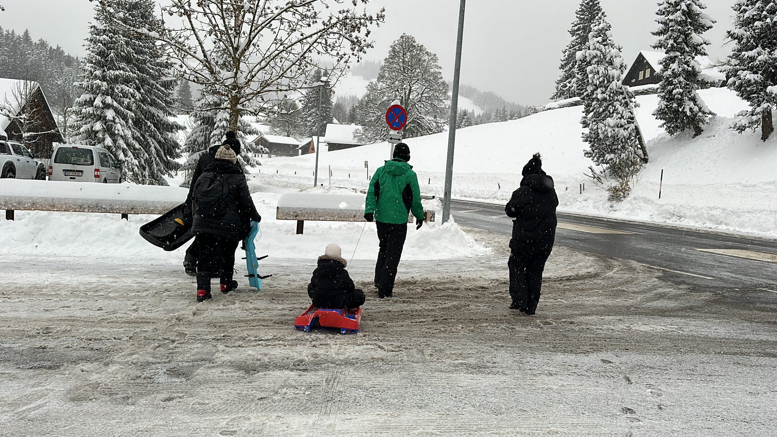 Am beliebten Rodelhügel waren trotz stetigem Schneefall auch einige Eltern mit ihren Kindern. Auch eine Gruppe aus Ungarn traf VOL.AT dort an. Er lebe in Vorarlberg, erklärte ein Mitglied. Seine Schwester sowie ein paar Freunde besuchten ihn und nutzen prompt den Neuschnee für eine Rodeltour.