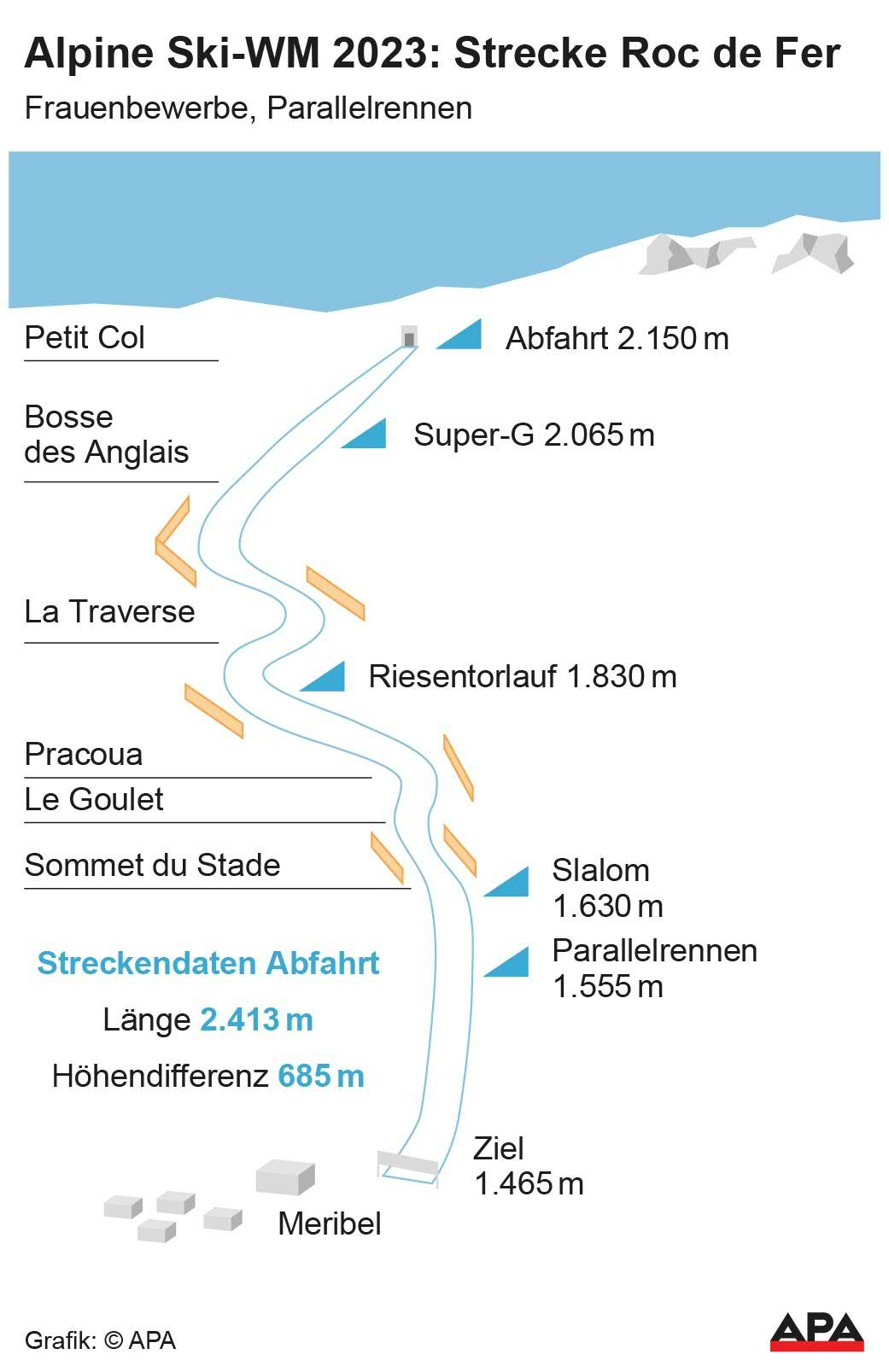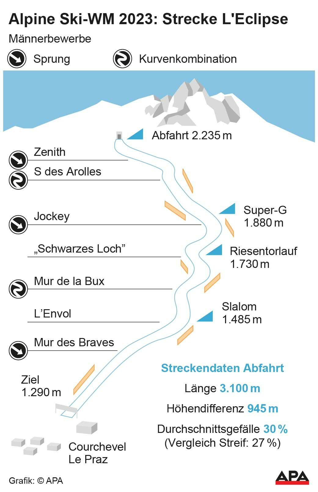 Gänzlich neu ist die Piste für die Männer. Die 3.200 Meter lange "Eclipse" startet unterhalb des Chenus-Gipfel und endet nach dem finalen Steilhang neben den Skisprungschanzen von Courchevel im Ortsteil Le Praz.