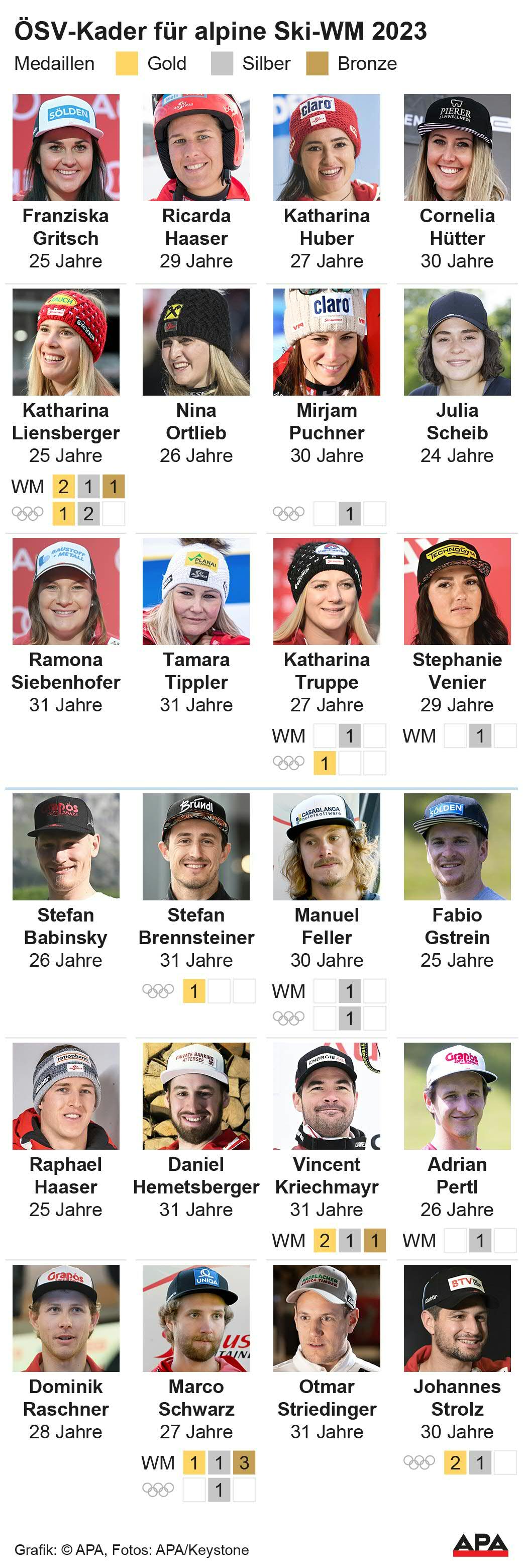 "Wir reisen nicht als Topfavoriten nach Frankreich, zählen aber zum erweiterten Favoritenkreis", sagte ÖSV-Präsidentin Roswitha Stadlober der APA - Austria Presse Agentur vor der nun 47. Alpin-WM. "Vier bis sechs Medaillen", lautete ihre Zielvorgabe. "Die Stärken liegen beim Herren-Team, keine Frage. Da haben wir in jeder Disziplin ein bis zwei, die um Medaillen mitfahren können", betonte ÖSV-Alpinchef Herbert Mandl, der "fünf bis sechs Medaillen" für realistisch hält.