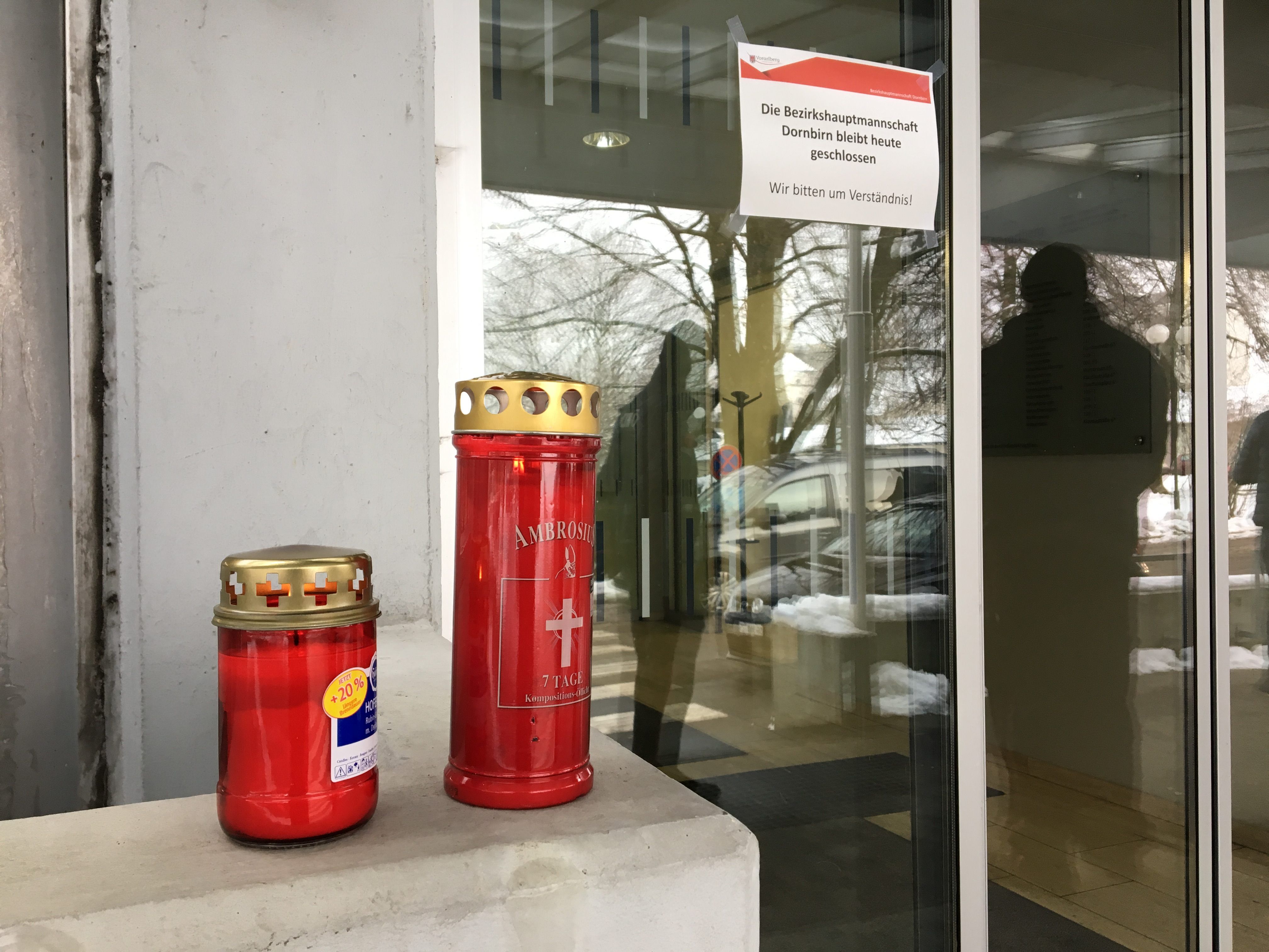 Trauerflor, Gedenkkerzen und Securitys vor dem Eingang sind am Donnerstag vor der Bezirkshauptmannschaft in Dornbirn zu sehen. Einen Tag nach der tödlichen Attacke auf den Leiter der Sozialabteilung bleibt das Amt zumindest am heutigen Donnerstag geschlossen.