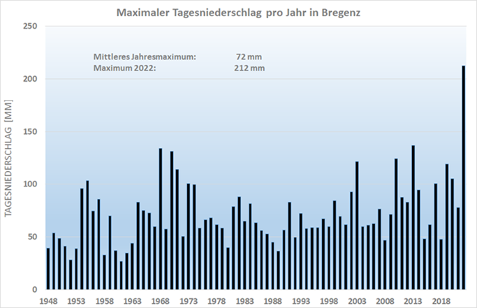 Das ist neuer Bundeslandrekord. Auch Feldkirch erlebte an diesem Tag die stärksten Regenfälle seit Beginn der Aufzeichnungen 1895.