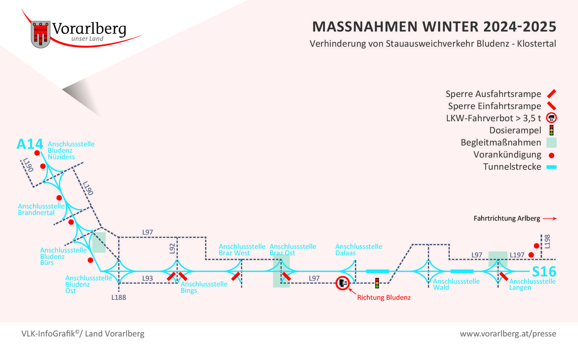 Als Begleitmaßnahme ist an den genannten Samstagen auch eine Dosierampel auf der L97 zur Bündelung des Verkehrs bei der Ortseinfahrt von Dalaas vorgesehen. In Langen ist beim Zusammentreffen der L97 mit der L197 eine Regelung durch Handzeichen geplant, um das Einfahren von Klösterle kommend zu erleichtern. In Bludenz wird von der Stadt Bludenz ein Einfahrtsverbot in die Klarenbrunnstraße in Fahrtrichtung Klarenbrunn/Moos umgesetzt.