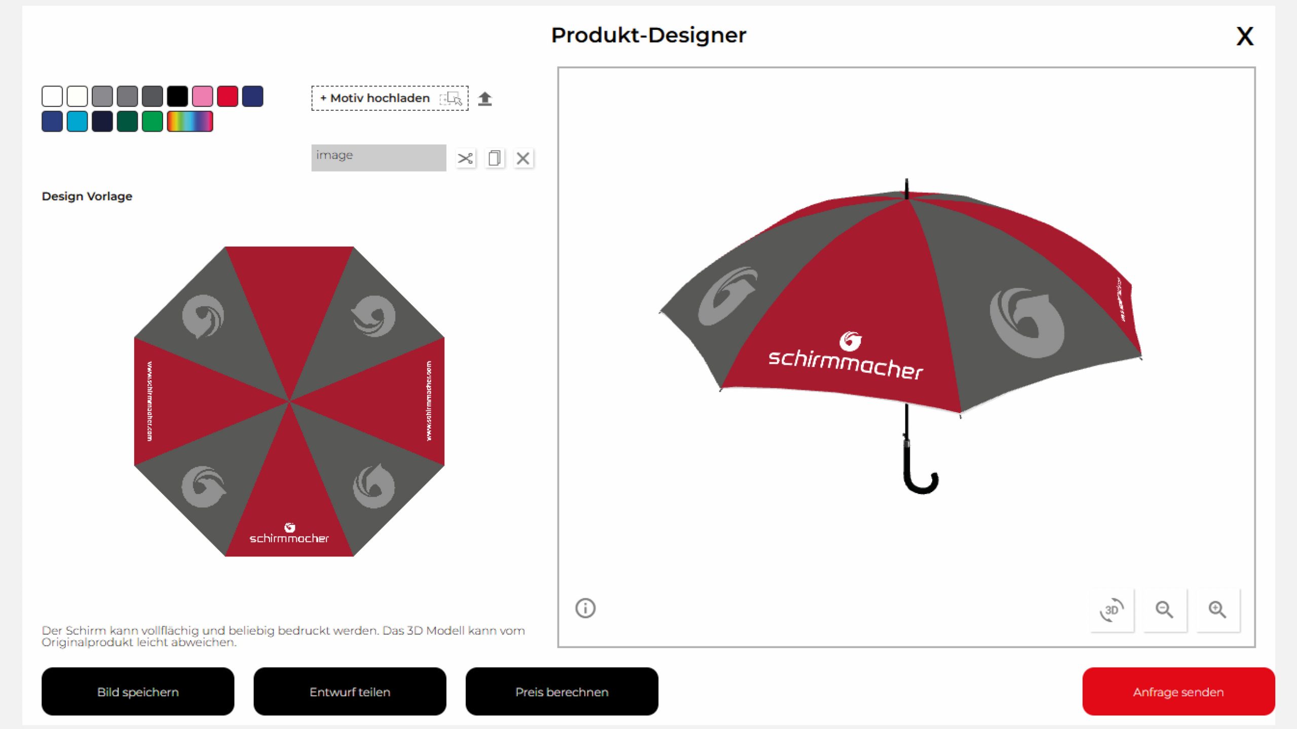 „Der 3D-Designer bietet unseren Website-Besuchern einen großen Mehrwert. Auf sehr einfache Weise erhält man nicht nur ein Bild, sondern ein komplettes 3D-Modell des eigenen, individuellen Produkts“, erklärt Christian Ströhle, Geschäftsführer von Schirmmacher.