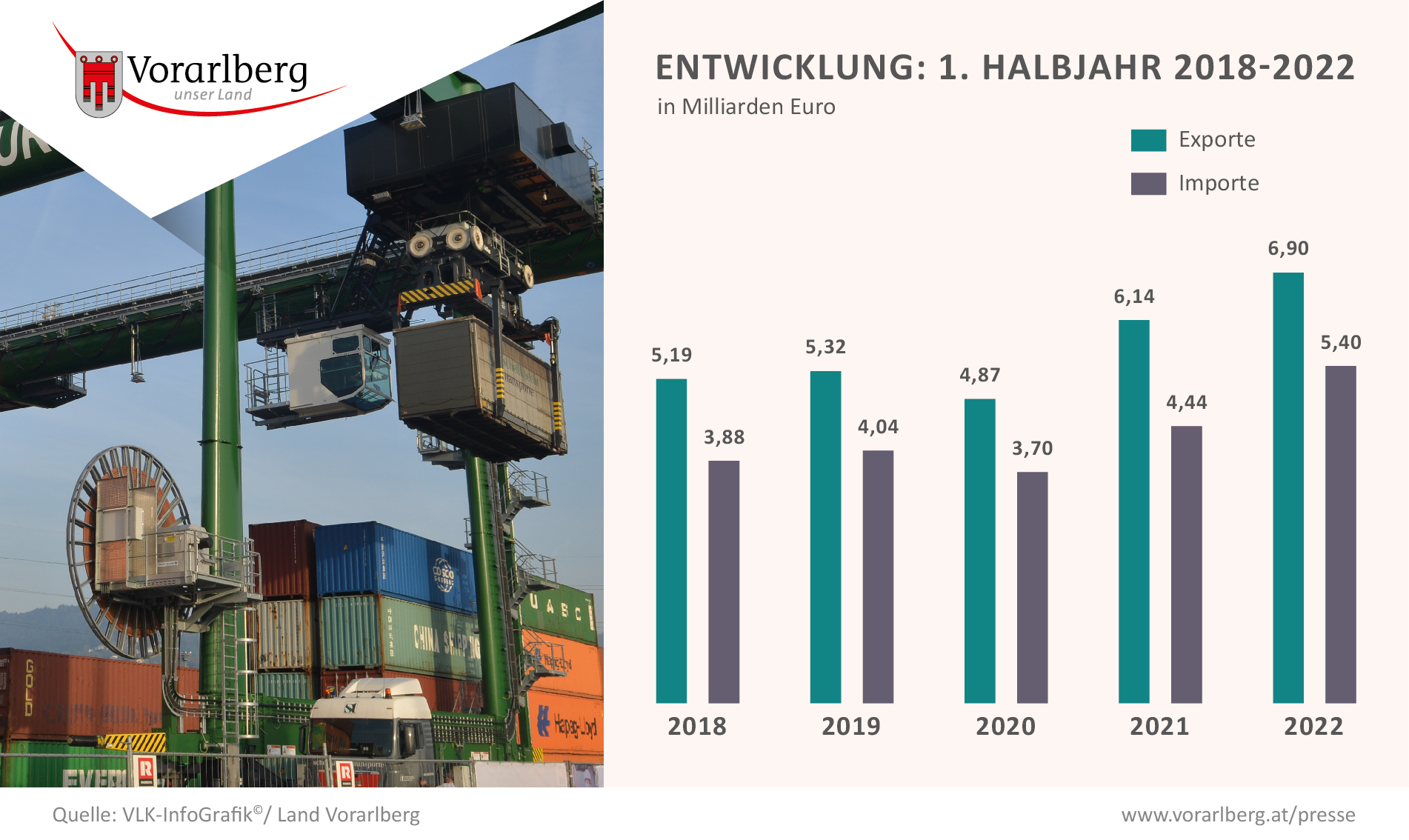 Landeshauptmann Markus Wallner und Wirtschaftslandesrat Marco Tittler sowie der Präsident der Vorarlberger Wirtschaftskammer, Wilfried Hopfner, zeigen sich höchst erfreut über diesen klaren Beleg für Vorarlbergs Wettbewerbsfähigkeit. In den ersten sechs Monaten des Jahres sind nach vorläufigen Ergebnissen Güter bzw. Waren im Gesamtwert von fast 6,9 Milliarden Euro ausgeführt worden – der Wert der Einfuhren betrug rund 5,4 Milliarden Euro. Landeshauptmann Wallner: "Trotz aller Widrigkeiten bleibt Vorarlbergs starker Außenhandel auf Erfolgskurs!"