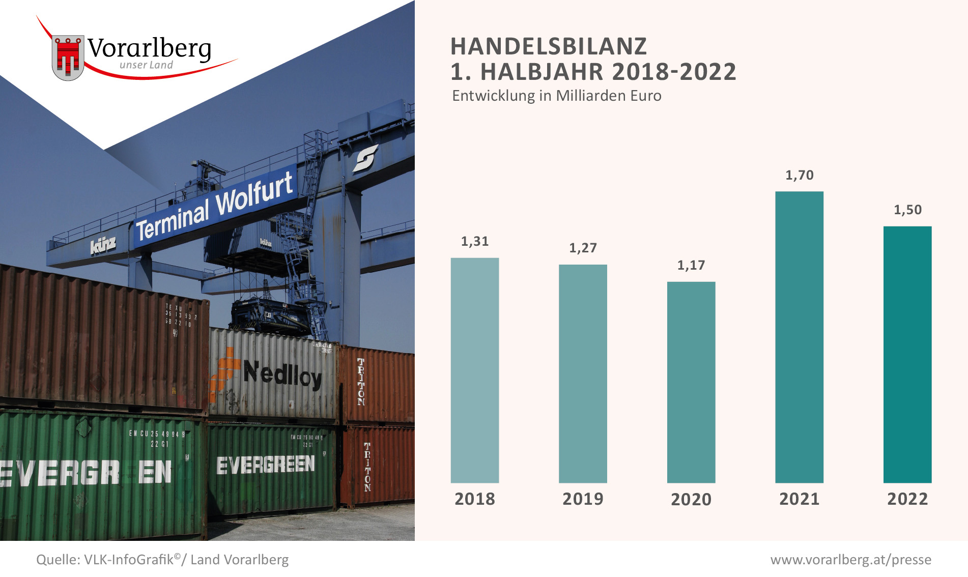 Die Vorarlberger Wirtschaft pflegt aktive Außenhandelsbeziehungen mit rund 217 Ländern und Territorien weltweit und exportiert deutlich mehr Güter als sie importiert. Die Handelsbilanz mit dem Ausland ist deshalb positiv. Im 1. Halbjahr 2022 lag das Exportvolumen um erheblich mehr als ein Viertel (27,7 Prozent) über dem Importvolumen – österreichweit der Spitzenwert. Annähernd zwei Drittel aller Ex- und Importe betreffen die Mitgliedsstaaten der Europäischen Union (EU-27). Der unangefochten größte Handelsverbündete Vorarlbergs bleibt Deutschland mit einem Anteil von 27 Prozent am Gesamtvolumen der Exporte und 37,6 Prozent bei den Importen. Die Ausfuhren betrugen 1.863 Mio. Euro (+8,6 Prozent), die Einfuhren 2.032 Mio. Euro (+27 Prozent). Innerhalb der EU-27 ist Italien die zweitwichtigste Handelspartnerschaft, danach kommen Frankreich, Polen und Tschechien. Die EFTA mit den Nachbarländern Schweiz und Liechtenstein ist der zweitwichtigste Wirtschaftsraum für Vorarlbergs Außenhandel. Das Exportvolumen betrug 910 Mio. Euro (+13,2 Prozent), das Importvolumen 679 Mio. Euro (+1,7 Prozent).